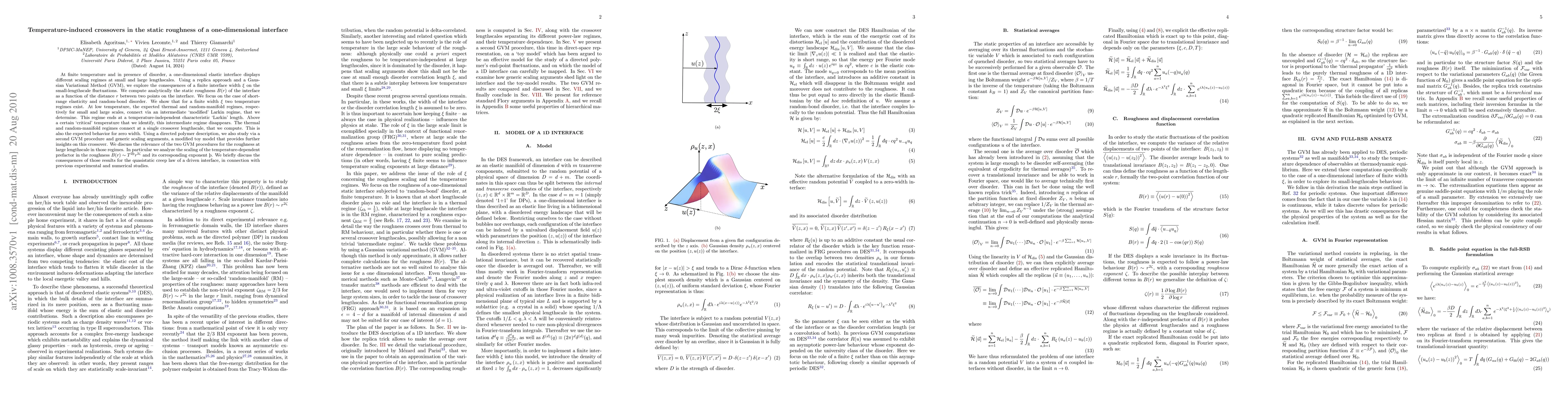 This paper investigates the static roughness of a one-dimensional elastic interface at finite temperature and disorder, revealing two temperature regimes. It employs a Gaussian Variational Method to analytically determine the roughness function and identifies crossovers between thermal and random-manifold regimes, providing insights into the quasistatic creep law of driven interfaces.