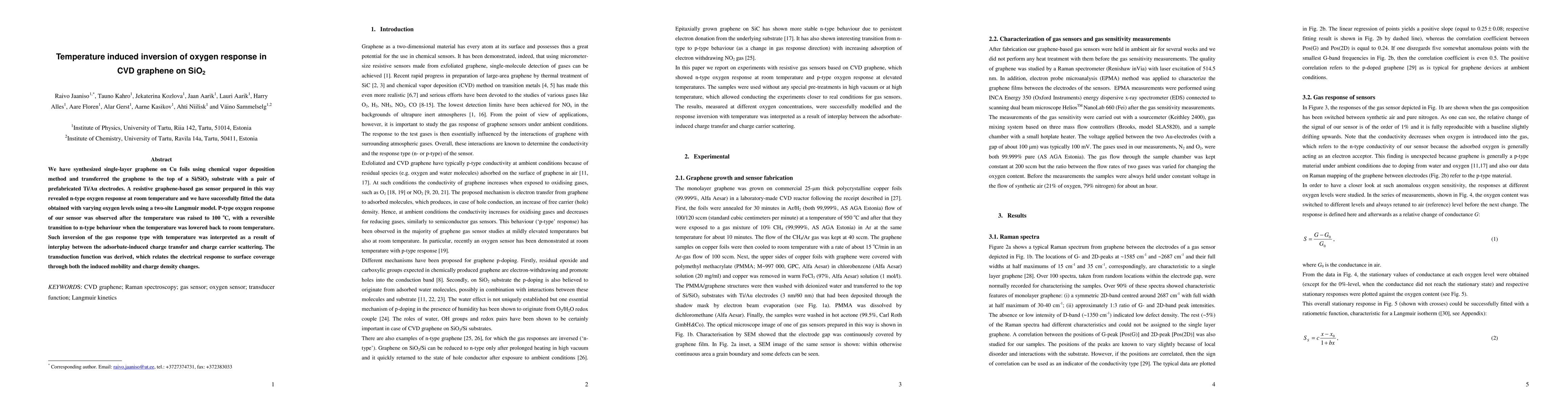 This study synthesizes single-layer graphene using CVD and transfers it onto a Si/SiO2 substrate to create a resistive gas sensor. Initially, the sensor shows n-type oxygen response at room temperature, which inverts to p-type when heated to 100°C, reversing back to n-type upon cooling; this temperature-induced inversion is explained by charge transfer and scattering interactions.