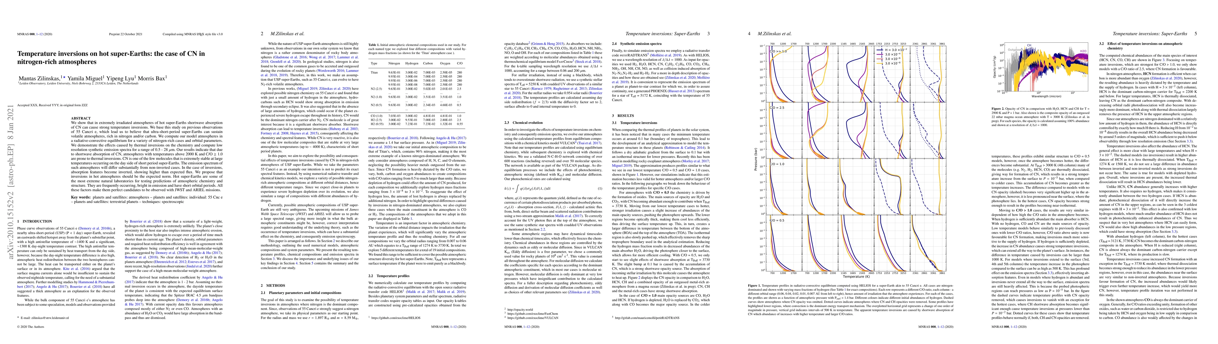This paper investigates how shortwave absorption by CN in nitrogen-rich atmospheres of hot super-Earths can lead to strong temperature inversions, using models based on observations of 55 Cancri e. The study finds that inversions are likely in atmospheres with high temperatures and C/O ratios, affecting emission spectra and suggesting that such inversions should be common in these extreme environments.