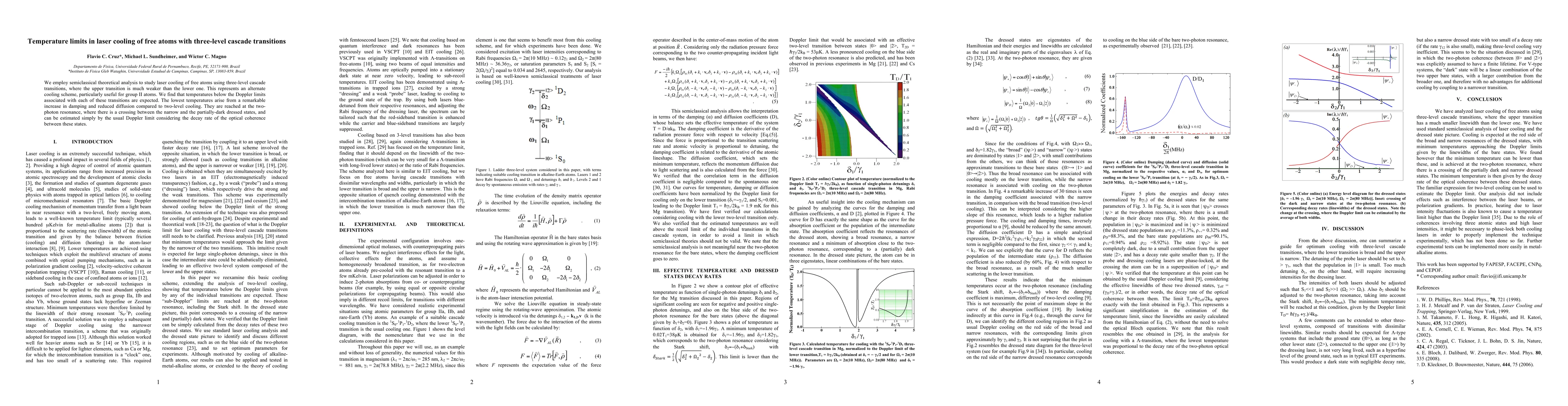 This paper investigates laser cooling of free atoms using three-level cascade transitions, finding temperatures below Doppler limits through enhanced damping and reduced diffusion. The lowest temperatures are achieved at two-photon resonance, where the dressed states intersect, and can be estimated by the decay rate of optical coherence.