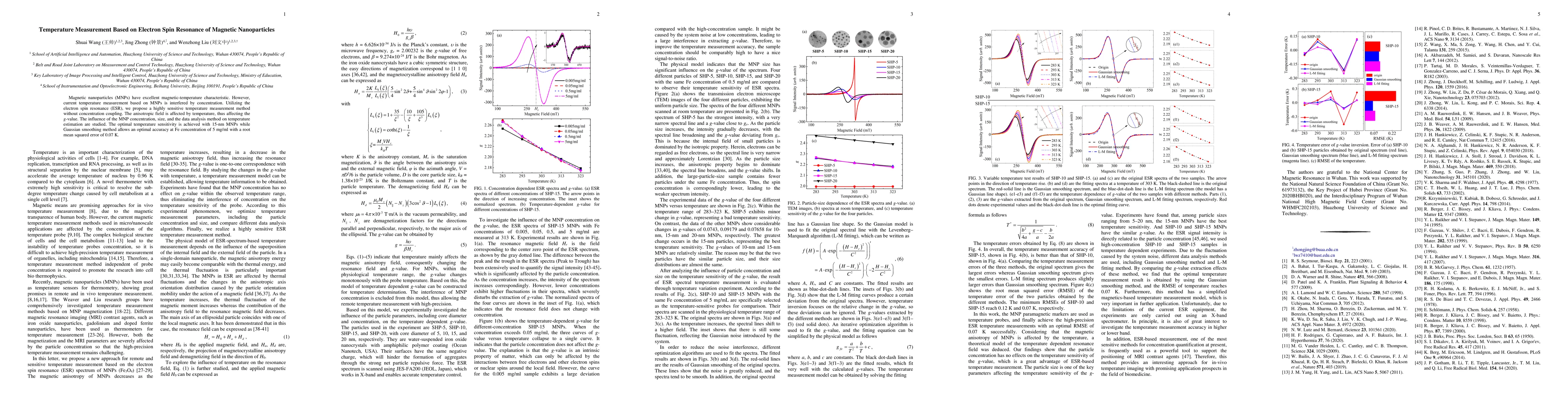 This paper proposes a novel temperature measurement method using electron spin resonance (ESR) of magnetic nanoparticles (MNPs) that is unaffected by MNP concentration. The study finds that temperature sensitivity is optimal with 15-nm MNPs and Gaussian smoothing, achieving a root mean squared error of 0.07 K at 5 mg/ml Fe concentration.