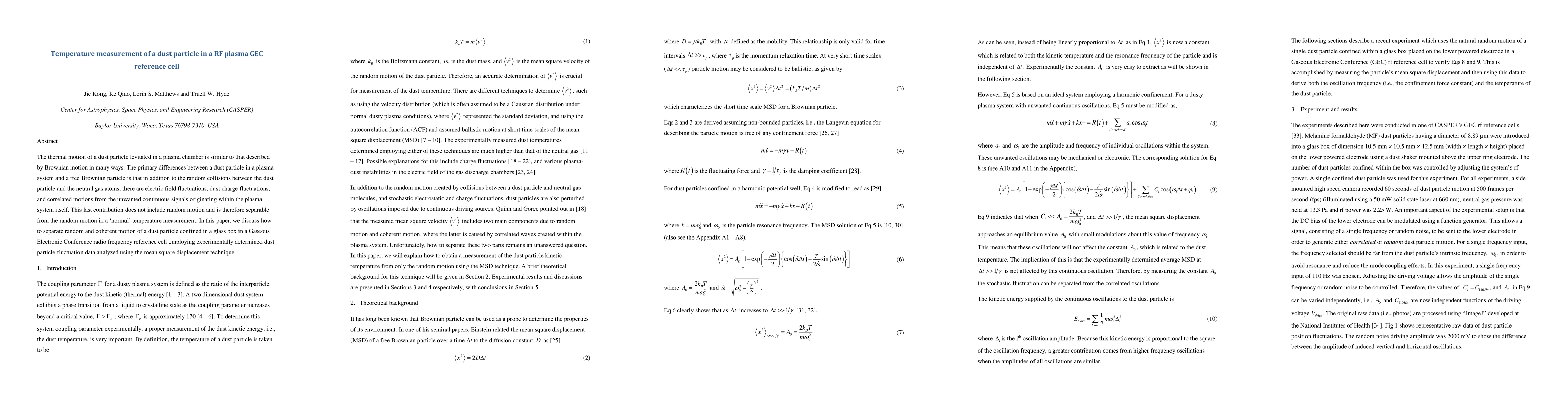 The thermal motion of a dust particle levitated in a plasma chamber is similar to that described by Brownian motion in many ways. The primary differences between a dust particle in a plasma system and a free Brownian particle is that in addition to the random collisions between the dust particle and the neutral gas atoms, there are electric field fluctuations, dust charge fluctuations, and correlated motions from the unwanted continuous signals originating within the plasma system itself. This last contribution does not include random motion and is therefore separable from the random motion in a normal temperature measurement. In this paper, we discuss how to separate random and coherent motion of a dust particle confined in a glass box in a Gaseous Electronic Conference radio frequency reference cell employing experimentally determined dust particle fluctuation data analyzed using the mean square displacement technique.