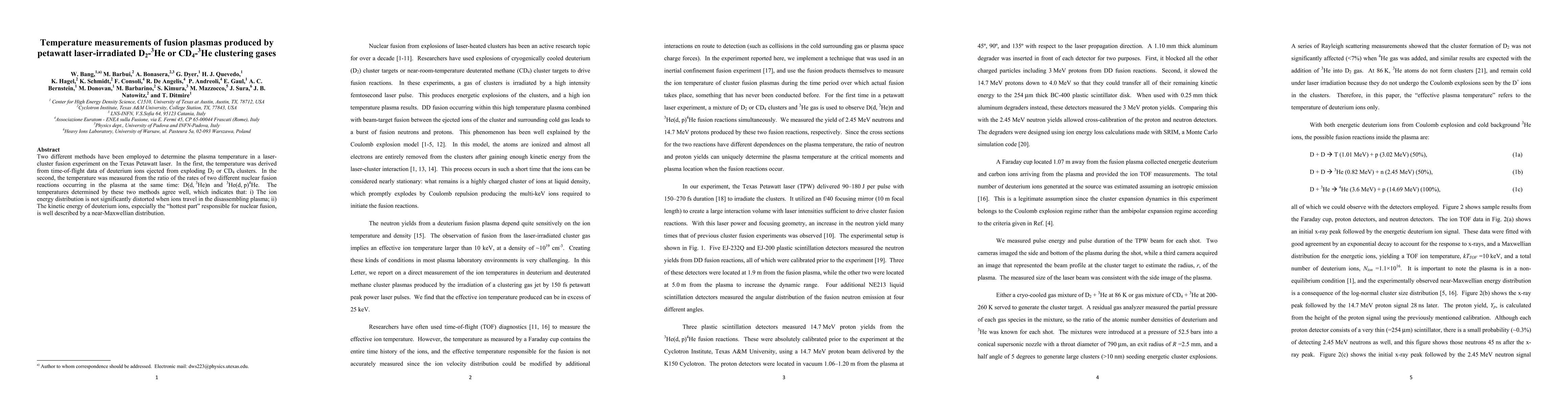 This paper investigates plasma temperatures in laser-cluster fusion experiments using two methods: time-of-flight data of deuterium ions and nuclear fusion reaction rates. Both methods yield consistent temperature measurements, indicating a near-Maxwellian ion energy distribution.