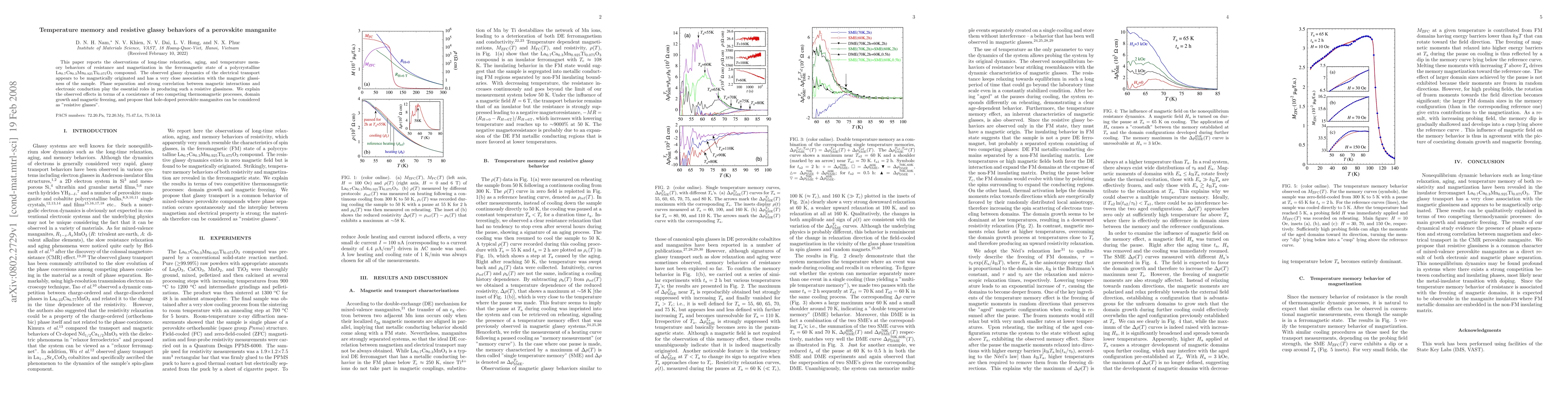 The paper examines a perovskite manganite compound, La0.7Ca0.3Mn0.925Ti0.075O3, revealing glassy electrical transport dynamics linked to magnetic glassiness. Phase separation and magnetic-electronic interaction correlation are identified as key factors. The study suggests considering hole-doped perovskite manganites as 'resistive glasses', explaining observed effects through coexisting thermomagnetic processes: domain growth and magnetic freezing.