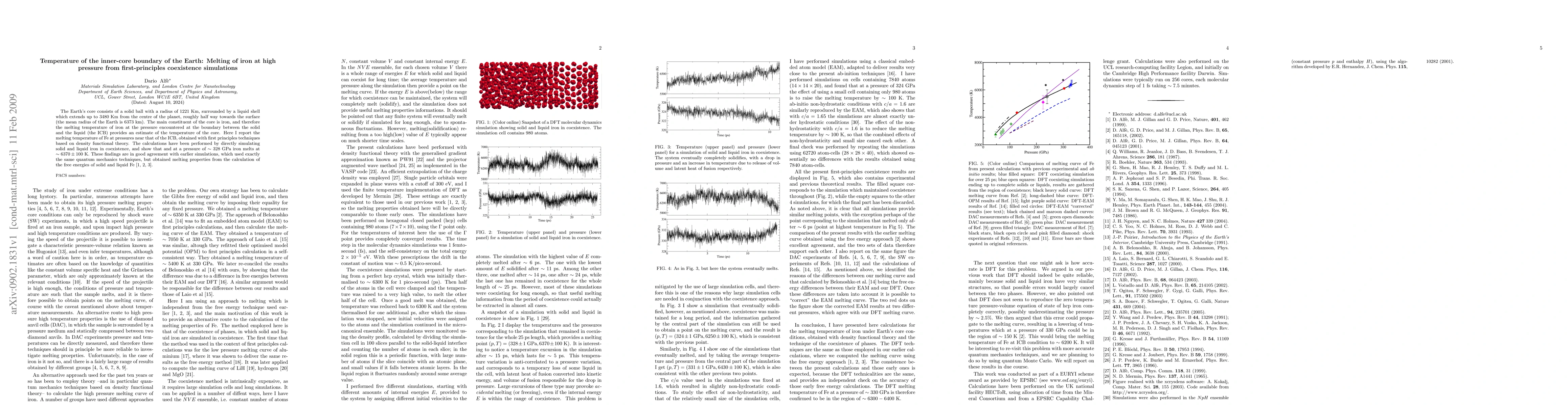 This research uses first-principles simulations to determine the melting temperature of iron at pressures near the Earth's inner-core boundary (ICB), finding it to be approximately 6370±100 K at 328 GPa, consistent with earlier simulations employing the same quantum mechanics techniques.