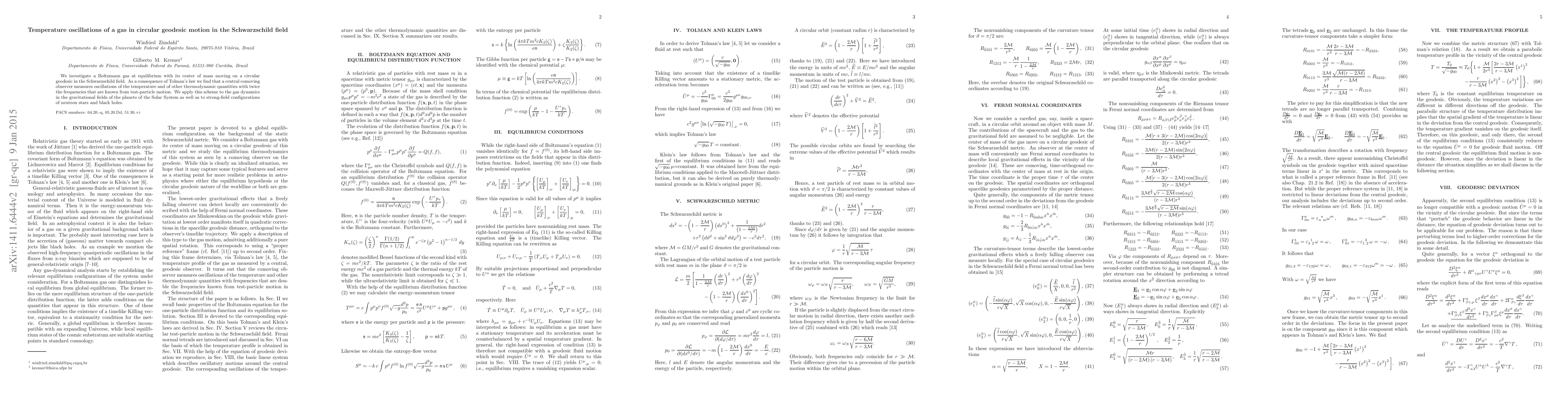 We investigate a Boltzmann gas at equilibrium with its center of mass moving on a circular geodesics in the Schwarzschild field. As a consequence of Tolman's law we find that a central comoving observer measures oscillations of the temperature and of other thermodynamic quantities with twice the frequencies that are known from test-particle motion. We apply this scheme to the gas dynamics in the gravitational fields of the planets of the Solar System as well as to strong-field configurations of neutron stars and black holes.