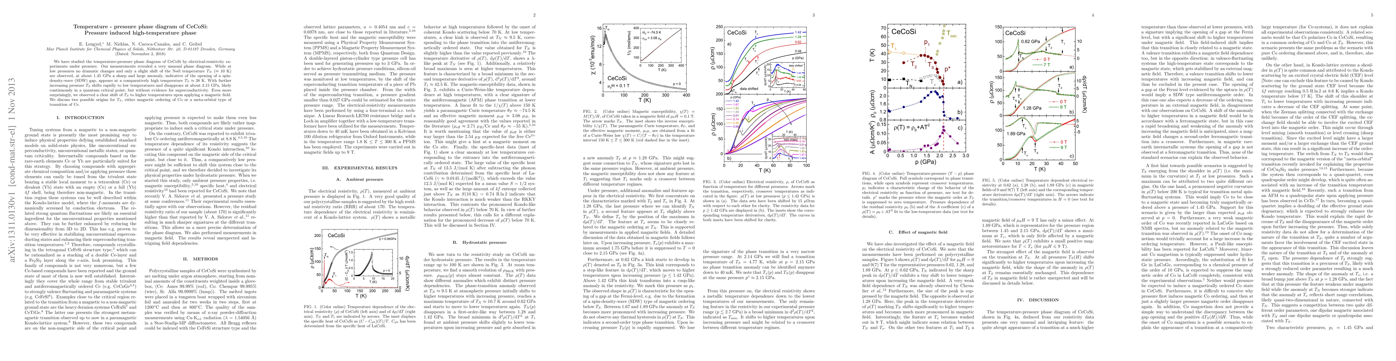 This study reveals a complex temperature-pressure phase diagram for CeCoSi, showing a sharp anomaly at 1.45 GPa leading to a spin-density-wave gap at high temperature, which disappears at 2.15 GPa, and surprisingly shifts to higher temperatures under magnetic field. The origin of this behavior is debated between magnetic ordering or a meta-orbital transition.