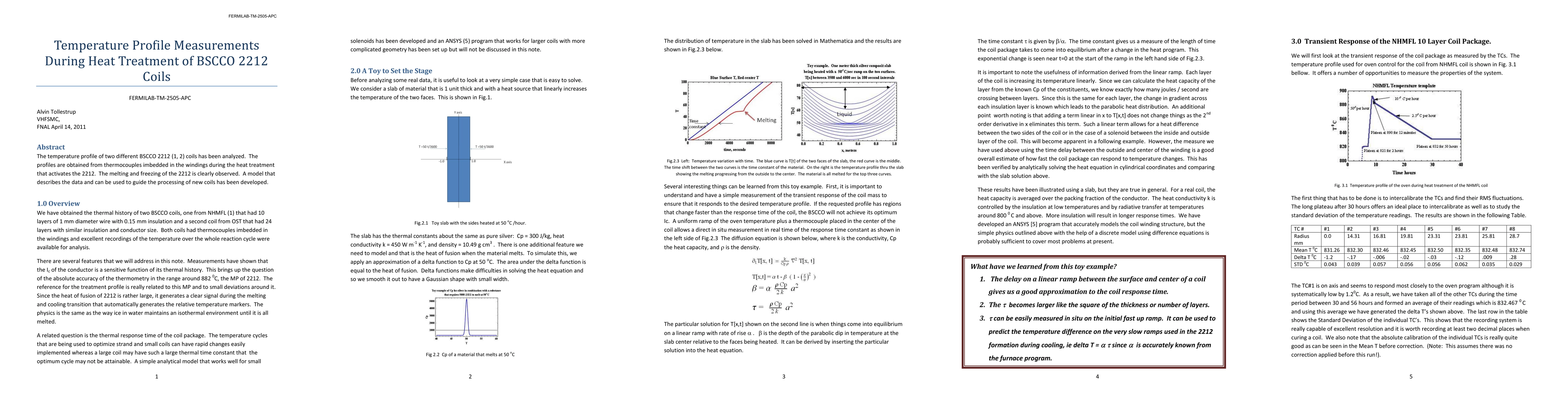 This study analyzes temperature profiles of two BSCCO 2212 coils during heat treatment, revealing the melting and freezing of 2212 through embedded thermocouples. A predictive model is developed to guide the processing of new coils based on the observed data.
