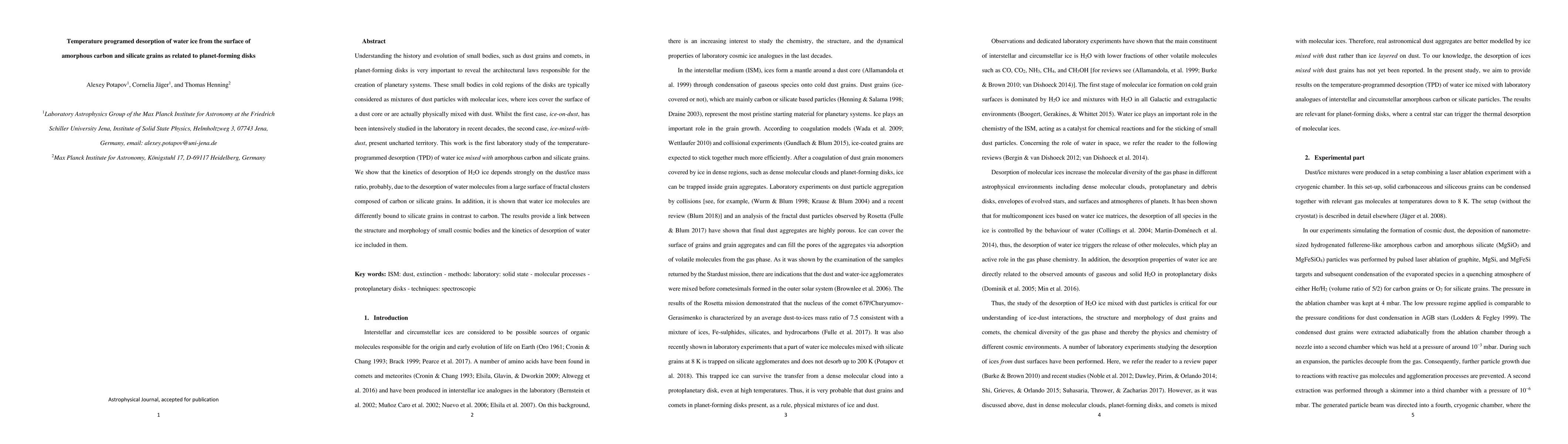 This paper investigates the temperature-programmed desorption of water ice mixed with amorphous carbon and silicate grains, revealing that desorption kinetics depend heavily on the dust/ice mass ratio. The study highlights differences in how water ice molecules are bound to silicate versus carbon grains, offering insights into the structure and evolution of small cosmic bodies in planet-forming disks.
