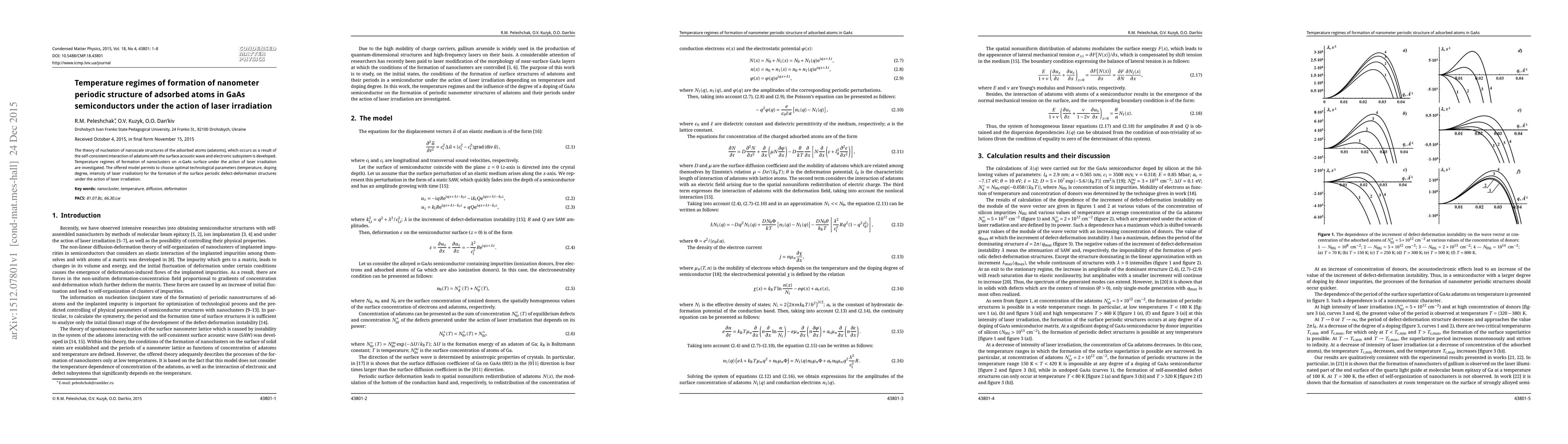 The theory of nucleation of nanoscale structures of the adsorbed atoms (adatoms), which occurs as a result of the self-consistent interaction of adatoms with the surface acoustic wave and electronic subsystem is developed. Temperature regimes of formation of nanoclusters on ${n}$-GaAs surface under the action of laser irradiation are investigated. The offered model permits to choose optimal technological parameters (temperature, doping degree, intensity of laser irradiation) for the formation of the surface periodic defect-deformation structures under the action of laser irradiation.