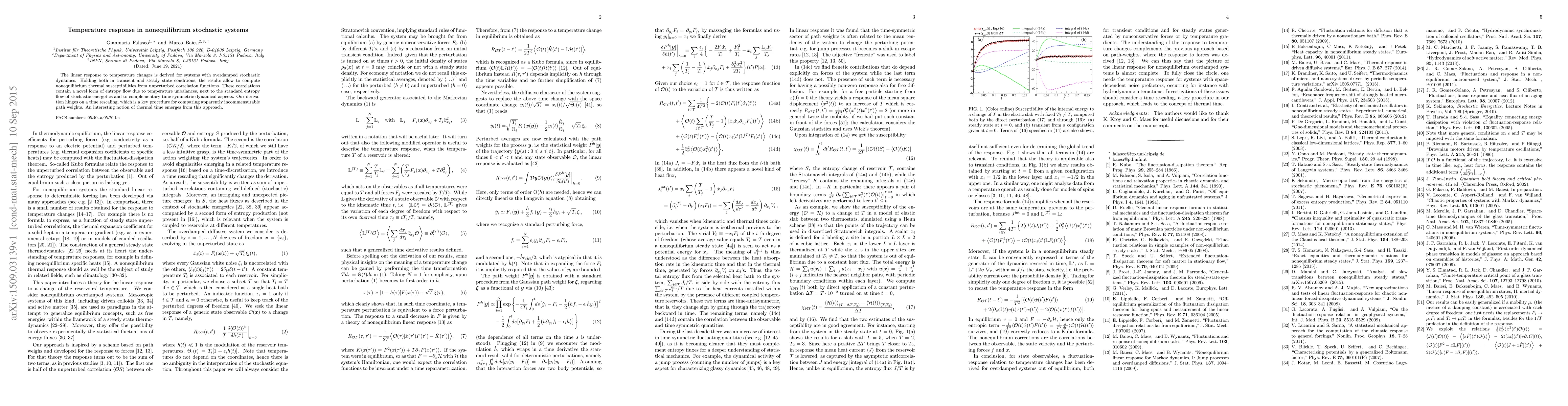 This paper derives the linear response to temperature changes in overdamped stochastic systems, allowing computation of nonequilibrium thermal susceptibilities using unperturbed correlation functions. The analysis introduces a novel entropy flow due to temperature unbalances and employs time rescaling to compare path weights, revealing a concept of thermal time.