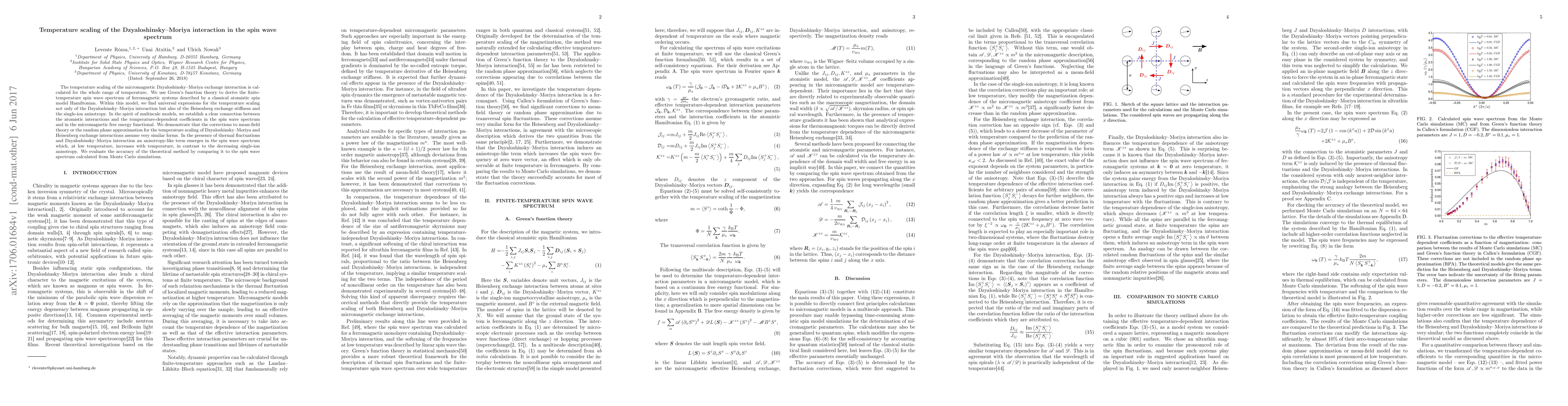 This paper calculates the temperature scaling of the Dzyaloshinsky-Moriya interaction in ferromagnetic systems using Green's function theory, revealing universal expressions for the scaling of this interaction and related terms. It also demonstrates a similar form for corrections to mean-field theory in temperature scaling and compares theoretical results with Monte Carlo simulations.