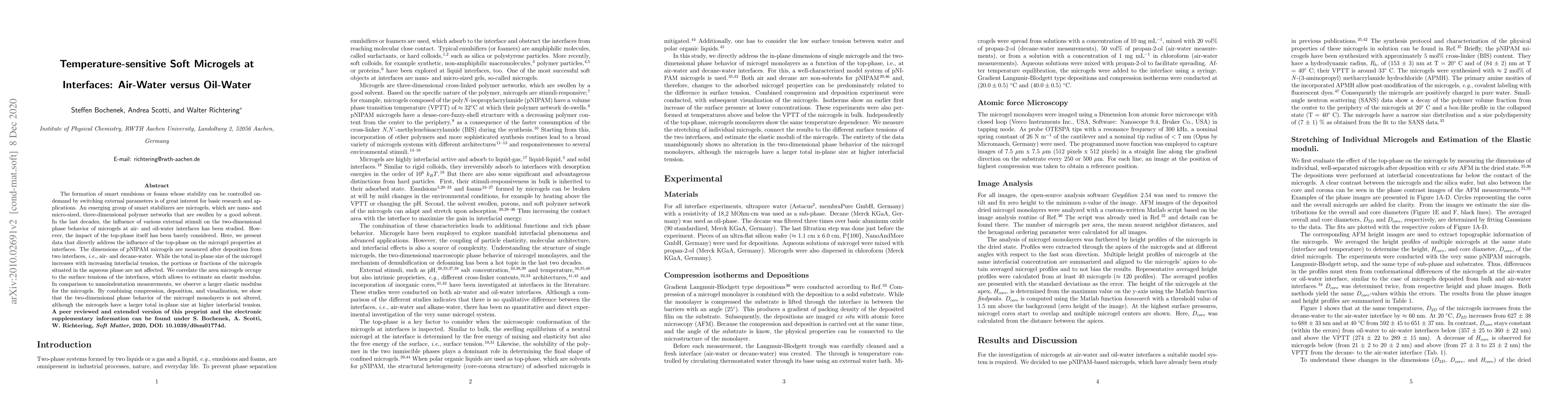 This study investigates the behavior of temperature-sensitive pNIPAM microgels at air-water and oil-water interfaces, revealing that the microgels' in-plane size increases with interfacial tension but their two-dimensional phase behavior remains unchanged. The research correlates microgel dimensions to interface surface tensions, providing insights into their elastic modulus and stability.