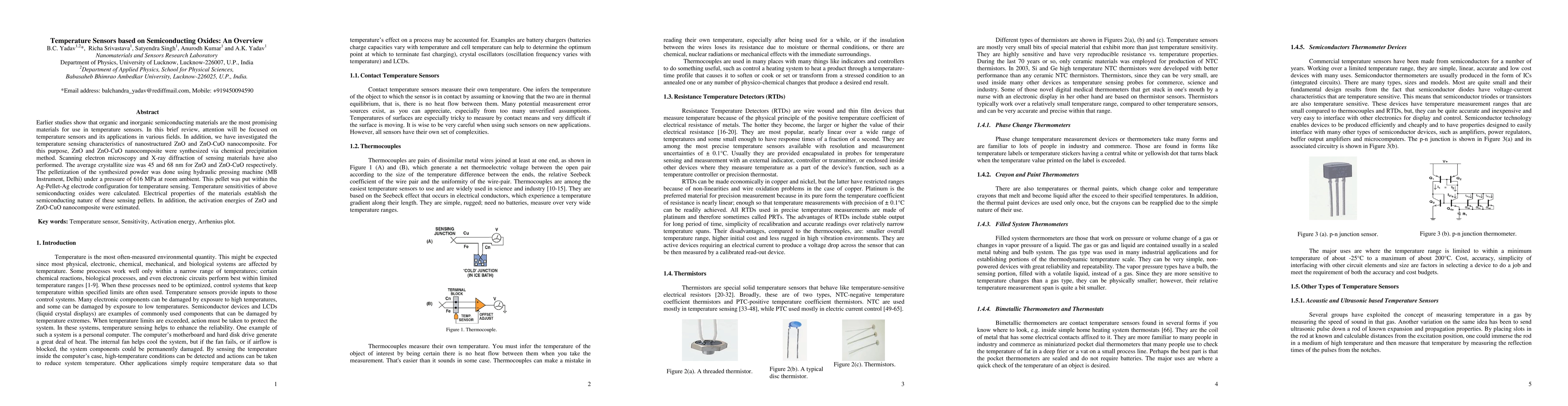Earlier studies show that organic and inorganic semiconducting materials are the most promising materials for use in temperature sensors. In this brief review, attention will be focused on temperature sensors and its applications in various fields. In addition, we have investigated the temperature sensing characteristics of nanostructured ZnO and ZnO-CuO nanocomposite. For this purpose, ZnO and ZnO-CuO nanocomposite were synthesized via chemical precipitation method. Scanning electron microscopy and X-ray diffraction of sensing materials have also performed. The average crystallite size was 45 and 68 nm for ZnO and ZnO-CuO respectively. The pelletization of the synthesized powder was done using hydraulic pressing machine (MB Instrument, Delhi) under a pressure of 616 MPa at room ambient. This pellet was put within the Ag-Pellet-Ag electrode configuration for temperature sensing. Temperature sensitivities of above semiconducting oxides were calculated. Electrical properties of the materials establish the semiconducting nature of these sensing pellets. In addition, the activation energies of ZnO and ZnO-CuO nanocomposite were estimated.