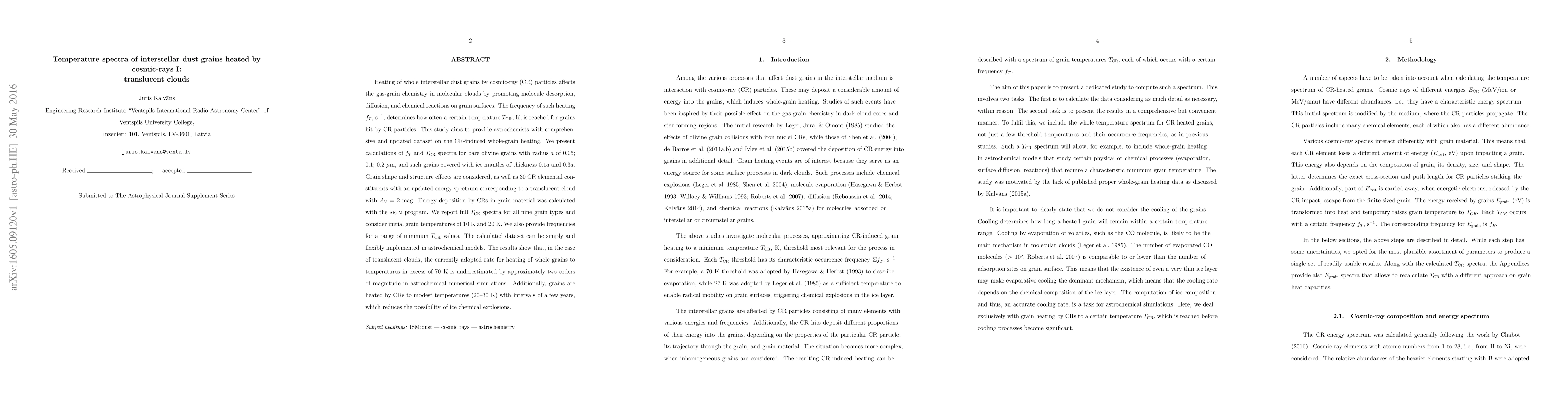 This study calculates the temperature spectra of interstellar dust grains heated by cosmic rays in translucent clouds, providing comprehensive datasets on CR-induced heating for different grain types. The results show that current heating rates in simulations are underestimated by two orders of magnitude, and CR heating prevents ice chemical explosions by heating grains to modest temperatures periodically.