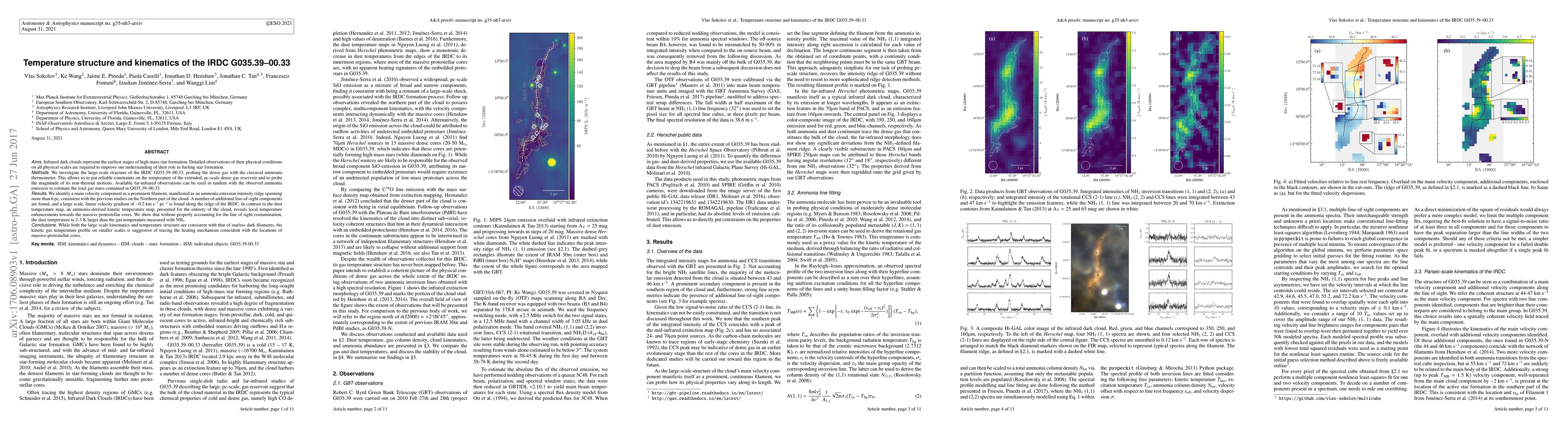 Aims. Infrared dark clouds represent the earliest stages of high-mass star formation. Detailed observations of their physical conditions on all physical scales are required to improve our understanding of their role in fueling star formation. Methods. We investigate the large-scale structure of the IRDC G035.39-00.33, probing the dense gas with the classical ammonia thermometer. This allows us to put reliable constraints on the temperature of the extended, pc-scale dense gas reservoir and to probe the magnitude of its non-thermal motions. Available far-infrared observations can be used in tandem with the observed ammonia emission to estimate the total gas mass contained in G035.39-00.33. Results. We identify a main velocity component as a prominent filament, manifested as an ammonia emission intensity ridge spanning more than 6 pc, consistent with the previous studies on the Northern part of the cloud. A number of additional line-of-sight components are found, and a large scale, linear velocity gradient of ~0.2 km s$^{-1}$ pc$^{-1}$ is found along the ridge of the IRDC. In contrast to the dust temperature map, an ammonia-derived kinetic temperature map, presented for the entirety of the cloud, reveals local temperature enhancements towards the massive protostellar cores. We show that without properly accounting for the line of sight contamination, the dust temperature is 2-3 K larger than the gas temperature measured with NH$_3$. Conclusions. While both the large scale kinematics and temperature structure are consistent with that of starless dark filaments, the kinetic gas temperature profile on smaller scales is suggestive of tracing the heating mechanism coincident with the locations of massive protostellar cores.