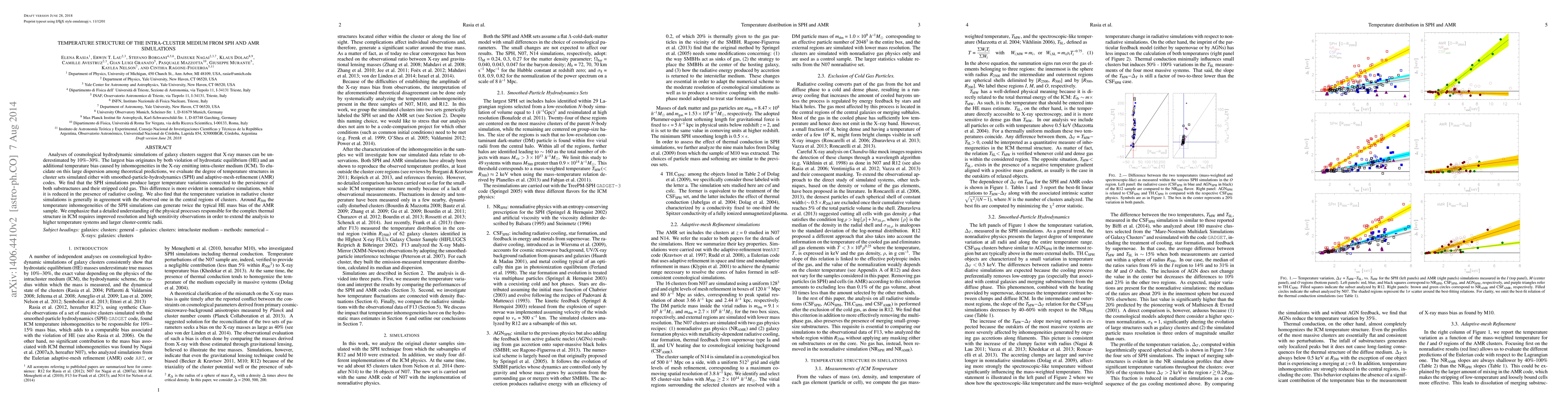 This paper investigates the temperature structure of the intra-cluster medium (ICM) using SPH and AMR simulations, finding that SPH simulations show larger temperature variations due to persistent substructures and stripped cold gas. Radiative cooling reduces these variations, aligning better with observed temperatures in the central regions of clusters.