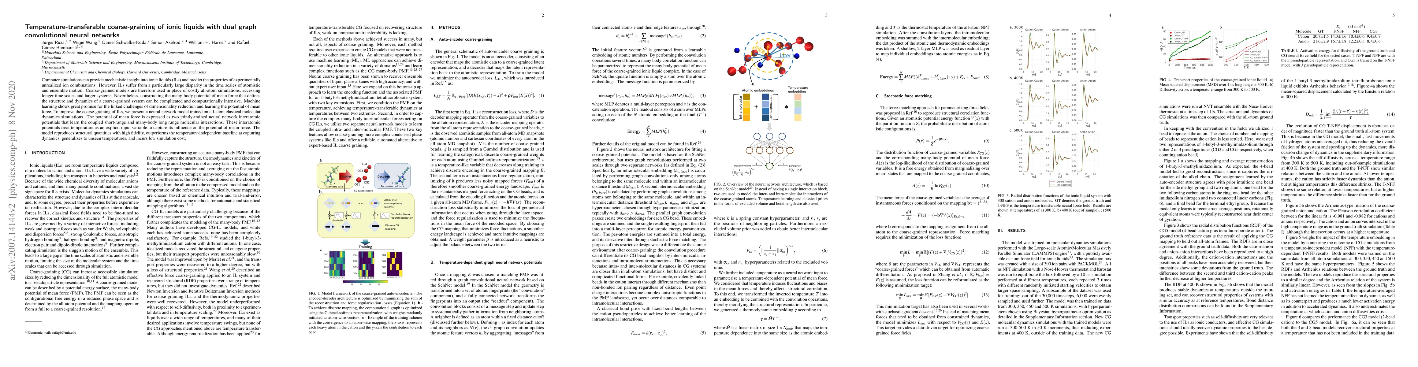 This paper introduces a dual graph convolutional neural network model to coarse-grain ionic liquids, capturing temperature-dependent potentials of mean force. The model effectively reduces simulation dimensionality and generalizes to new temperatures, offering a cost-effective alternative to atomistic simulations.