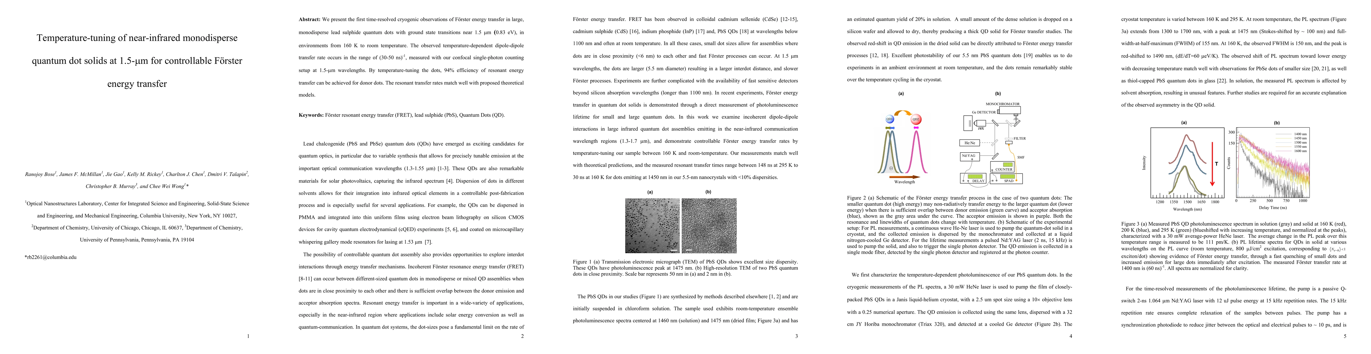 We present the first time-resolved cryogenic observations of Forster energy transfer in large, monodisperse lead sulphide quantum dots with ground state transitions near 1.5 um (0.83 eV), in environments from 160 K to room temperature. The observed temperature-dependent dipole-dipole transfer rate occurs in the range of (30-50 ns)^(-1), measured with our confocal single-photon counting setup at 1.5 um wavelengths. By temperature-tuning the dots, 94% efficiency of resonant energy transfer can be achieved for donor dots. The resonant transfer rates match well with proposed theoretical models.
