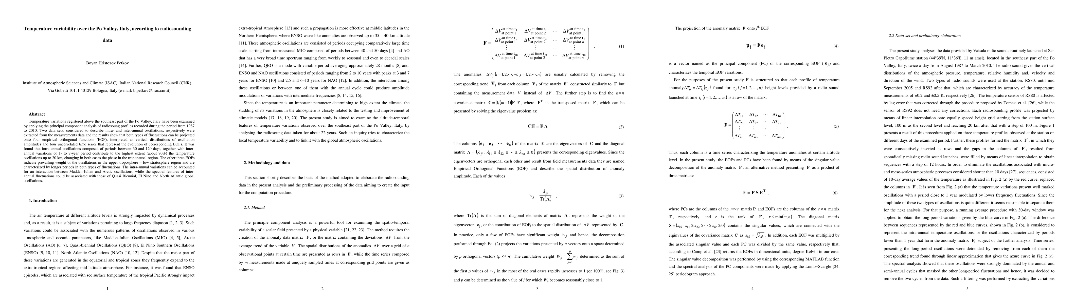 Temperature variations registered above the southeast part of the Po Valley, Italy have been examined by applying the principal component analysis of radiosoung profiles recorded during the period from 1987 to 2010. Two data sets, considered to describe intra- and inter-annual oscillations, respectively were extracted from the measurements data and the results show that both types of fluctuations can be projected onto four empirical orthogonal functions (EOF), interpreted as vertical distributions of oscillation amplitudes and four uncorrelated time series that represent the evolution of corresponding EOFs. It was found that intra-annual oscillations composed of periods between 30 and 120 days, together with inter-annual variations of 1- to 7-year period contribute to the highest extent (about 70 percents) the temperature oscillations up to 20 km, changing in both cases the phase in the tropopausal region. The other three EOFs indicate prevailing weight of the oscillations in the upper troposphere-low stratosphere region and are characterized by longer periods in both types of fluctuations. The intra-annual variations can be accounted for an interaction between Madden-Julian and Arctic oscillations, while the spectral features of inter-annual fluctuations could be associated with those of Quasi Biennial, El Nino and North Atlantic global oscillations.