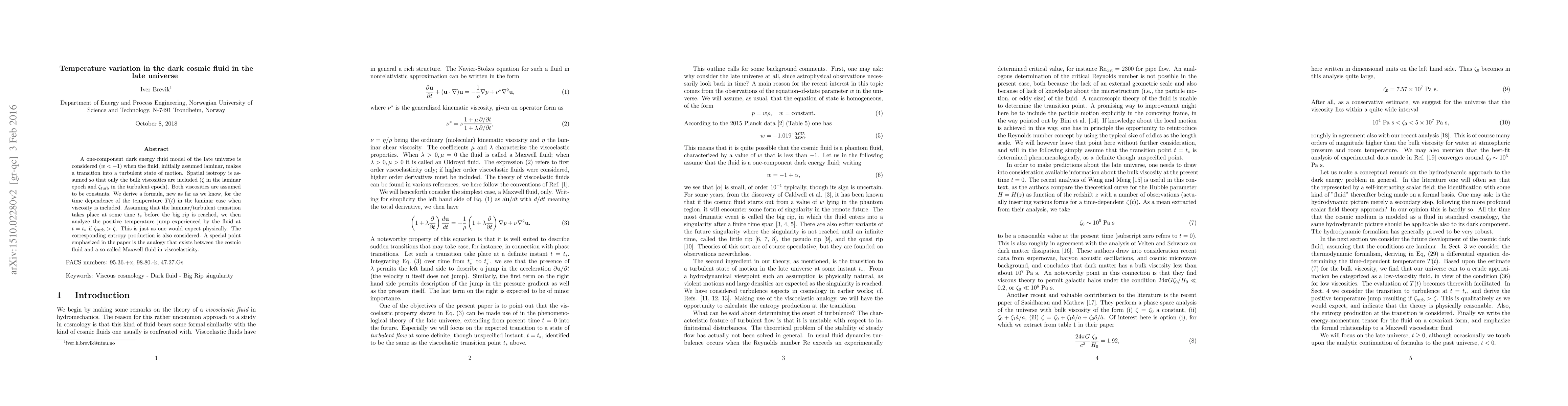 A one-component dark energy fluid model of the late universe is considered ($w<-1$) when the fluid, initially assumed laminar, makes a transition into a turbulent state of motion. Spatial isotropy is assumed so that only the bulk viscosities are included ($\zeta$ in the laminar epoch and $\zeta_{\rm turb}$ in the turbulent epoch). Both viscosities are assumed to be constants. We derive a formula, new as far as we know, for the time dependence of the temperature $T(t)$ in the laminar case when viscosity is included. Assuming that the laminar/turbulent transition takes place at some time $t_s$ before the big rip is reached, we then analyze the positive temperature jump experienced by the fluid at $t=t_*$ if $\zeta_{\rm turb} > \zeta$. This is just as one would expect physically. The corresponding entropy production is also considered. A special point emphasized in the paper is the analogy that exists between the cosmic fluid and a so-called Maxwell fluid in viscoelasticity.