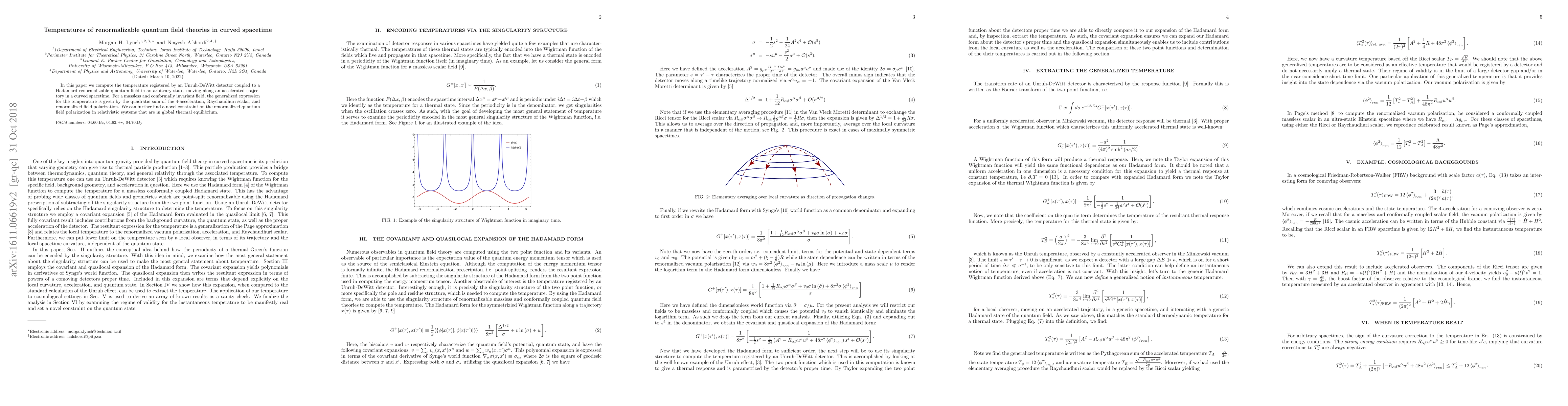 The paper presents a detailed derivation of the temperature registered by an Unruh-DeWitt detector in curved spacetime using a Hadamard renormalizable quantum field, providing a generalized temperature expression and novel constraints on renormalized quantum field polarization.