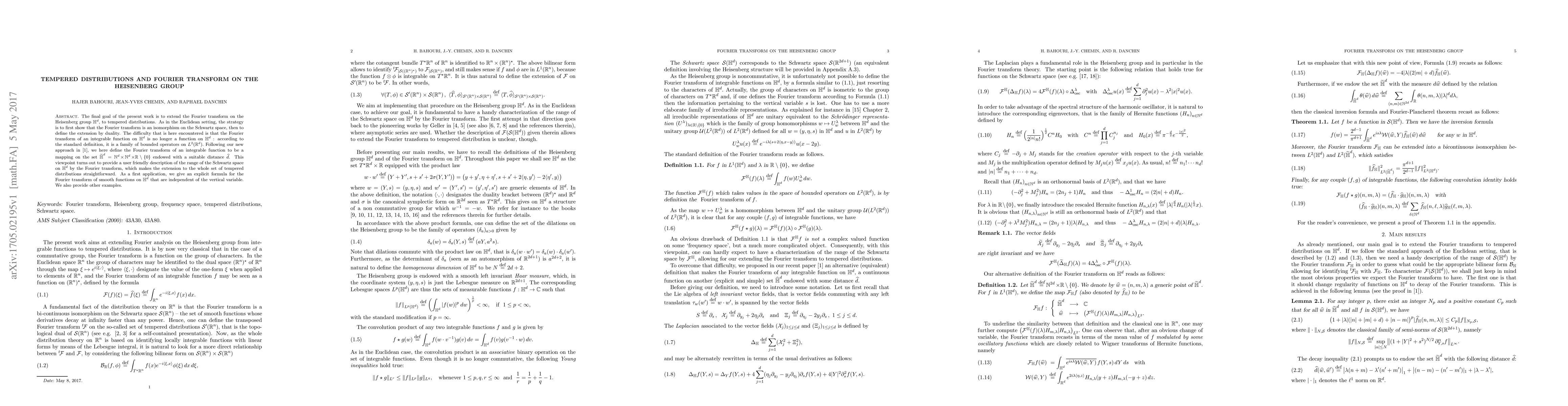 The final goal of the present work is to extend the Fourier transform on the Heisenberg group $\H^d,$ to tempered distributions. As in the Euclidean setting, the strategy is to first show that the Fourier transform is an isomorphism on the Schwartz space, then to define the extension by duality. The difficulty that is here encountered is that the Fourier transform of an integrable function on $\H^d$is no longer a function on $\H^d$ : according to the standard definition, it is a family of bounded operators on $L^2(\R^d).$ Following our new approach in\ccite{bcdFHspace}, we here define the Fourier transform of an integrable functionto be a mapping on the set~$\wt\H^d=\N^d\times\N^d\times\R\setminus\{0\}$endowed with a suitable distance $\wh d$.This viewpoint turns out to provide a user friendly description of the range of the Schwartz space on $\H^d$ by the Fourier transform, which makes the extension to the whole set of tempered distributions straightforward. As a first application, we give an explicit formula for the Fourier transform of smooth functions on $\H^d$ that are independent of the vertical variable. We also provide other examples.