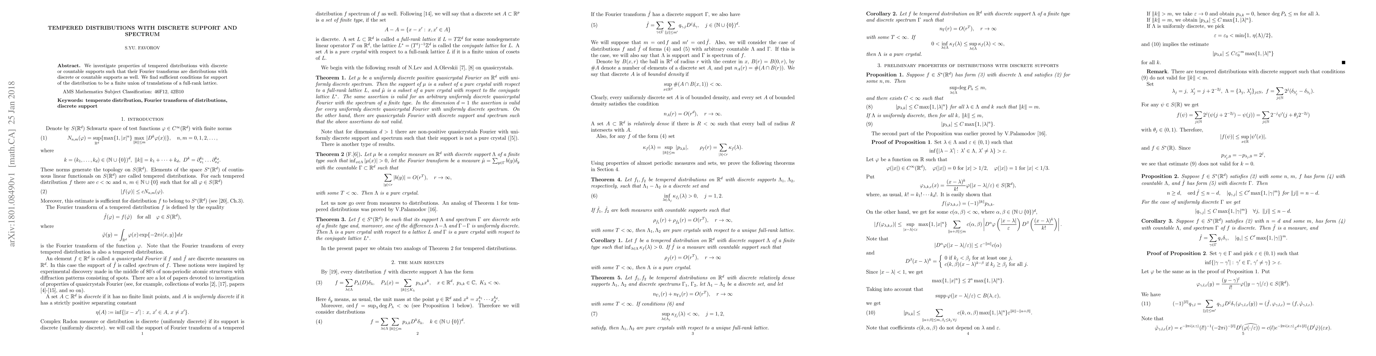 The paper presents detailed analysis and proofs concerning the structure of tempered distributions with discrete support and spectrum, leading to conditions for their almost periodicity.