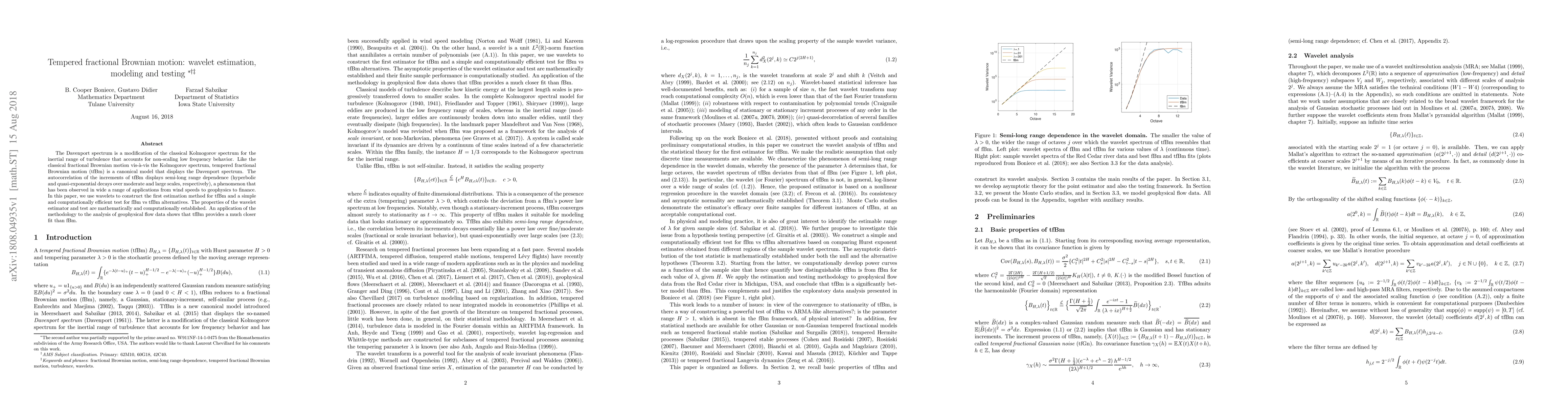 The Davenport spectrum is a modification of the classical Kolmogorov spectrum for the inertial range of turbulence that accounts for non-scaling low frequency behavior. Like the classical fractional Brownian motion vis-\`a-vis the Kolmogorov spectrum, tempered fractional Brownian motion (tfBm) is a canonical model that displays the Davenport spectrum. The autocorrelation of the increments of tfBm displays semi-long range dependence (hyperbolic and quasi-exponential decays over moderate and large scales, respectively), a phenomenon that has been observed in wide a range of applications from wind speeds to geophysics to finance. In this paper, we use wavelets to construct the first estimation method for tfBm and a simple and computationally efficient test for fBm vs tfBm alternatives. The properties of the wavelet estimator and test are mathematically and computationally established. An application of the methodology to the analysis of geophysical flow data shows that tfBm provides a much closer fit than fBm.