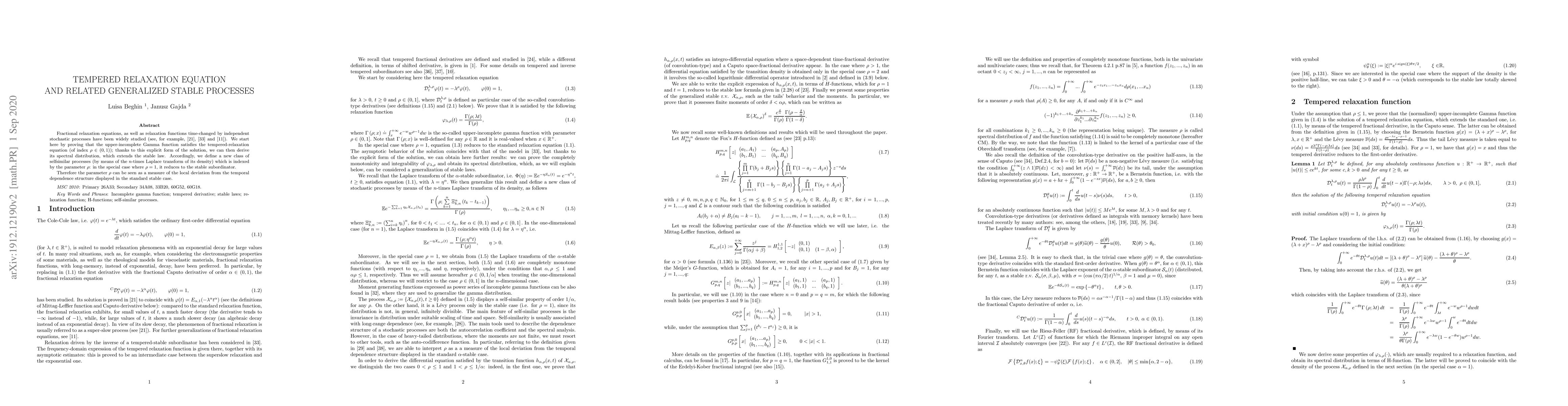 This paper proves that the upper-incomplete Gamma function solves the tempered-relaxation equation, deriving its spectral distribution that extends the stable law. It introduces a new class of selfsimilar processes indexed by $\rho$, which generalizes the stable subordinator when $\rho = 1$.
