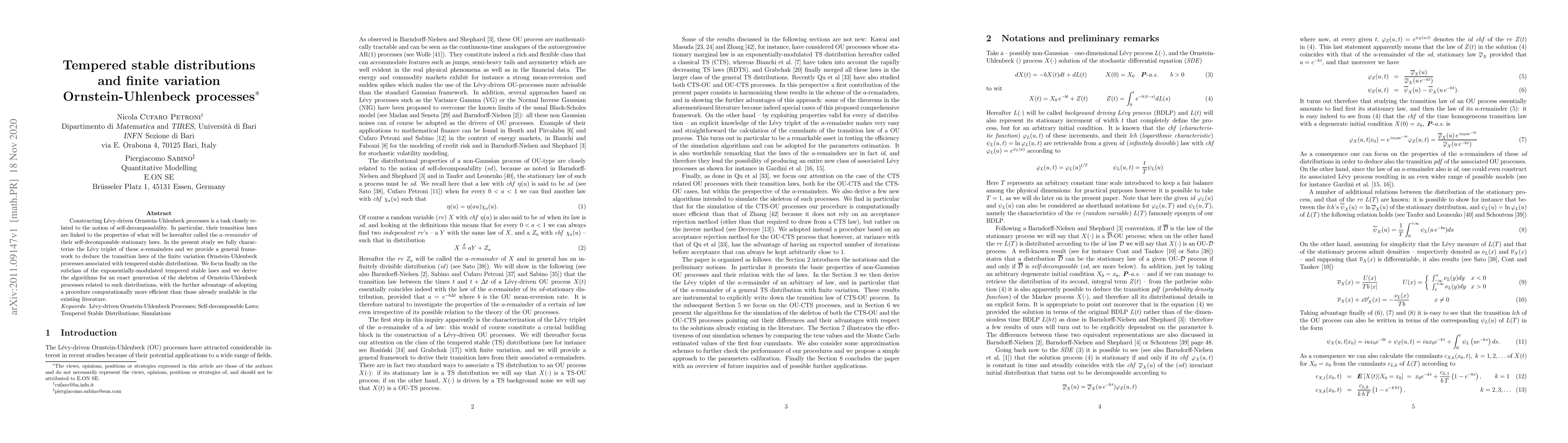 This paper characterizes the Lévy triplet of self-decomposable stationary laws, specifically the "a-reminder," and provides a framework for deriving transition laws of finite variation Ornstein-Uhlenbeck processes linked to tempered stable distributions. It also introduces efficient algorithms for generating the skeleton of these processes, outperforming existing methods.