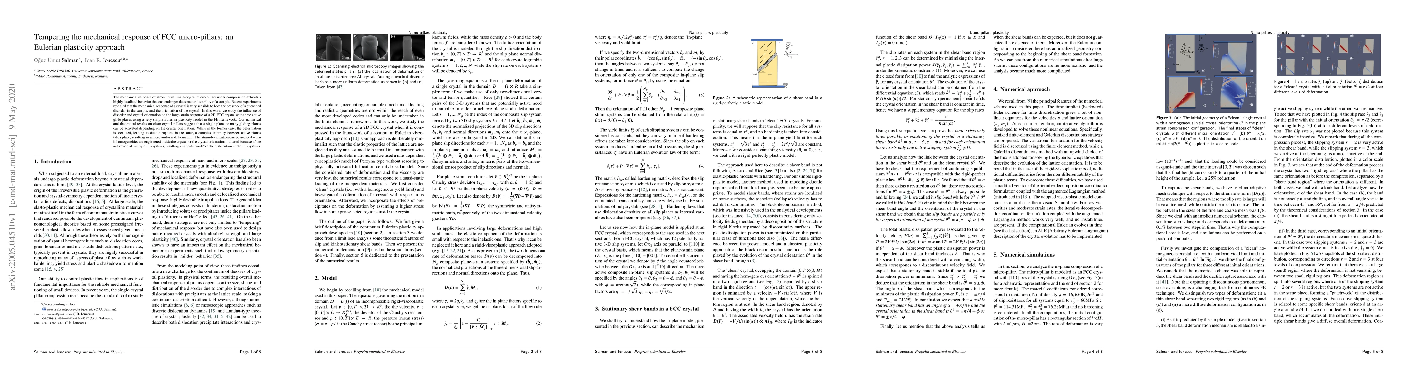 This paper investigates how disorder and crystal orientation affect the mechanical response of FCC micro-pillars under compression using an Eulerian plasticity model. It finds that localized deformation can be avoided by engineering inhomogeneities or altering orientation to activate multiple slip systems, leading to a more uniform deformation.
