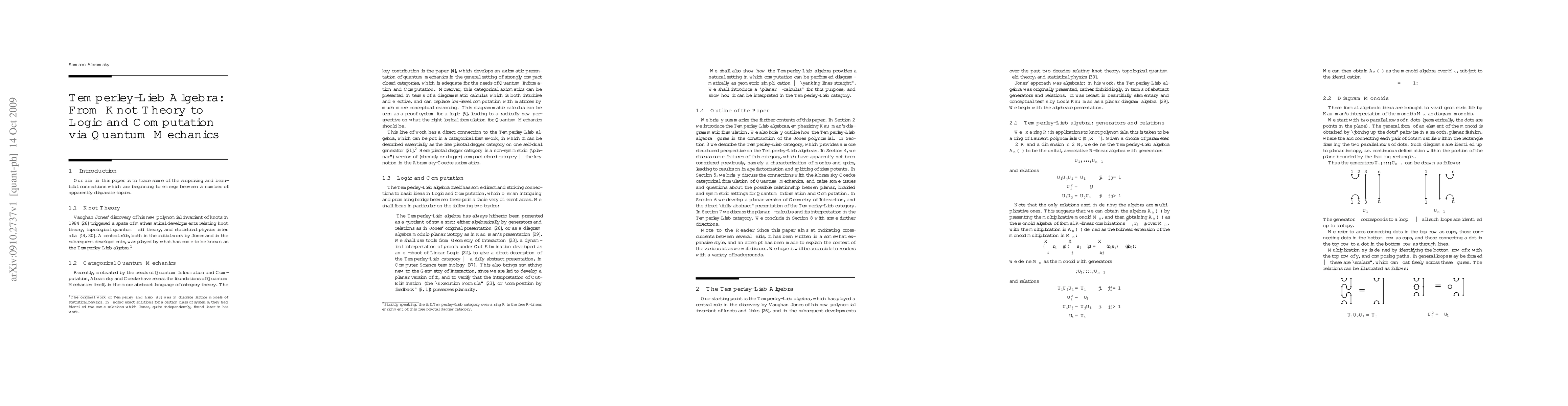 Our aim in this paper is to trace some of the surprising and beautiful connections which are beginning to emerge between a number of apparently disparate topics: Knot Theory, Categorical Quantum Mechanics, and Logic and Computation. We shall focus in particular on the following two topics: - The Temperley-Lieb algebra has always hitherto been presented as a quotient of some sort: either algebraically by generators and relations as in Jones' original presentation, or as a diagram algebra modulo planar isotopy as in Kauffman's presentation. We shall use tools from Geometry of Interaction, a dynamical interpretation of proofs under Cut Elimination developed as an off-shoot of Linear Logic, to give a direct description of the Temperley-Lieb category -- a "fully abstract presentation", in Computer Science terminology. This also brings something new to the Geometry of Interaction, since we are led to develop a planar version of it, and to verify that the interpretation of Cut-Elimination (the "Execution Formula", or "composition by feedback") preserves planarity. - We shall also show how the Temperley-Lieb algebra provides a natural setting in which computation can be performed diagrammatically as geometric simplification -- "yanking lines straight". We shall introduce a "planar lambda-calculus" for this purpose, and show how it can be interpreted in the Temperley-Lieb category.