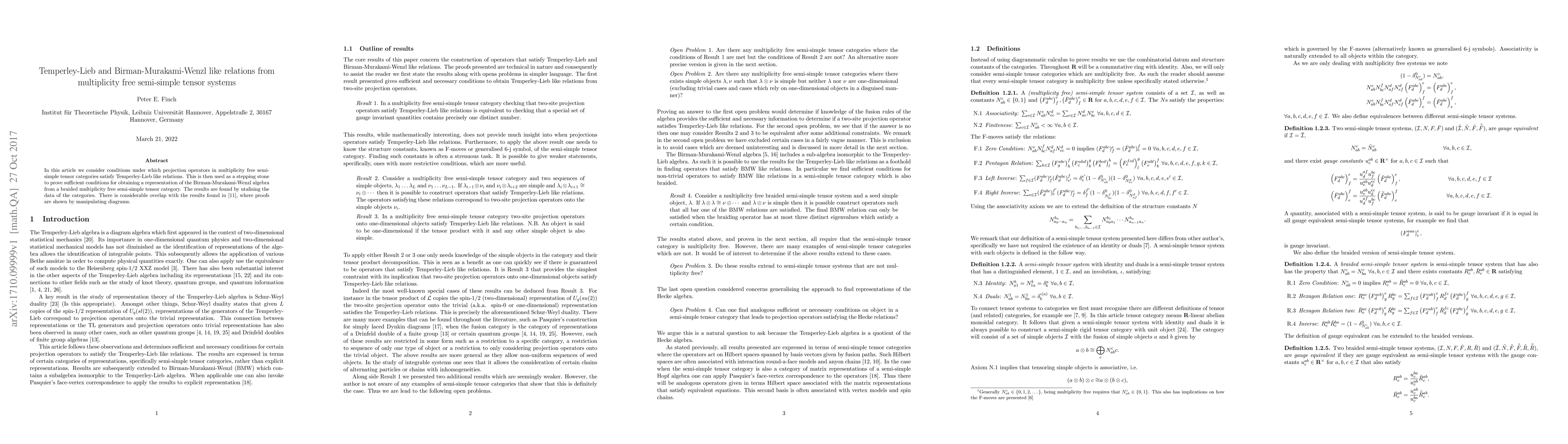 This paper investigates conditions for projection operators in semi-simple tensor categories to satisfy Temperley-Lieb relations, leading to a representation of the Birman-Murakami-Wenzl algebra.