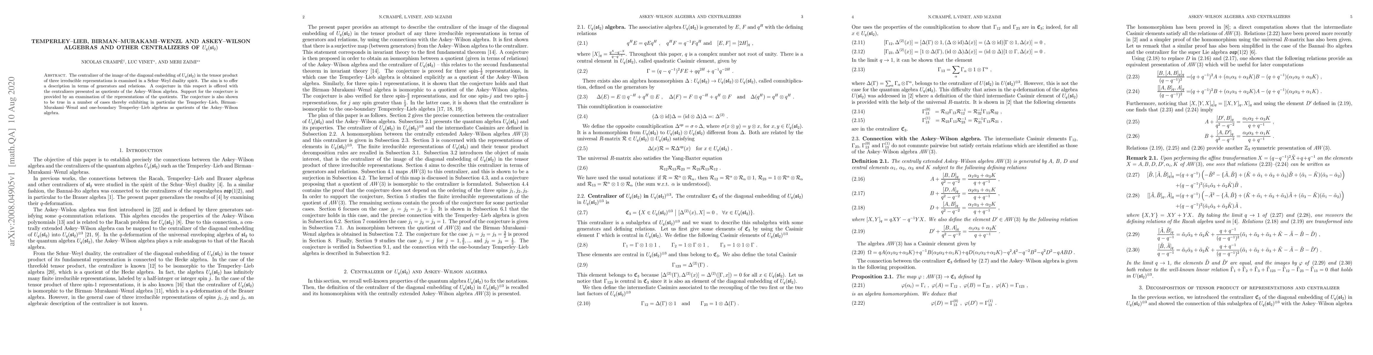 This paper explores the centralizers of $U_q(\mathfrak{sl}_2)$ within tensor products of three irreducible representations, describing them as quotients of the Askey-Wilson algebra and providing support for a conjecture that includes the Temperley-Lieb, Birman-Murakami-Wenzl, and one-boundary Temperley-Lieb algebras as special cases.