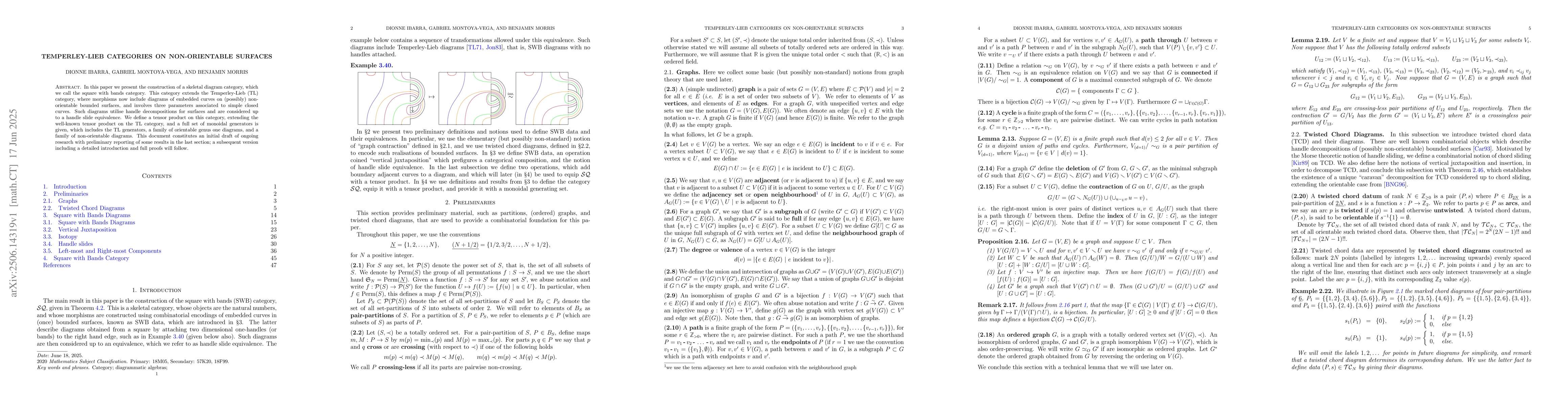 In this paper we present the construction of a skeletal diagram category, which we call the square with bands category. This category extends the Temperley-Lieb (TL) category, where morphisms now include diagrams of embedded curves on (possibly) non-orientable bounded surfaces, and involves three parameters associated to simple closed curves. Such diagrams utilise handle decompositions for surfaces and are considered up to a handle slide equivalence. We define a tensor product on this category, extending the well-known tensor product on the TL category, and a full set of monoidal generators is given, which includes the TL generators, a family of orientable genus one diagrams, and a family of non-orientable diagrams. This document constitutes an initial draft of ongoing research with preliminary reporting of some results in the last section; a subsequent version including a detailed introduction and full proofs will follow.