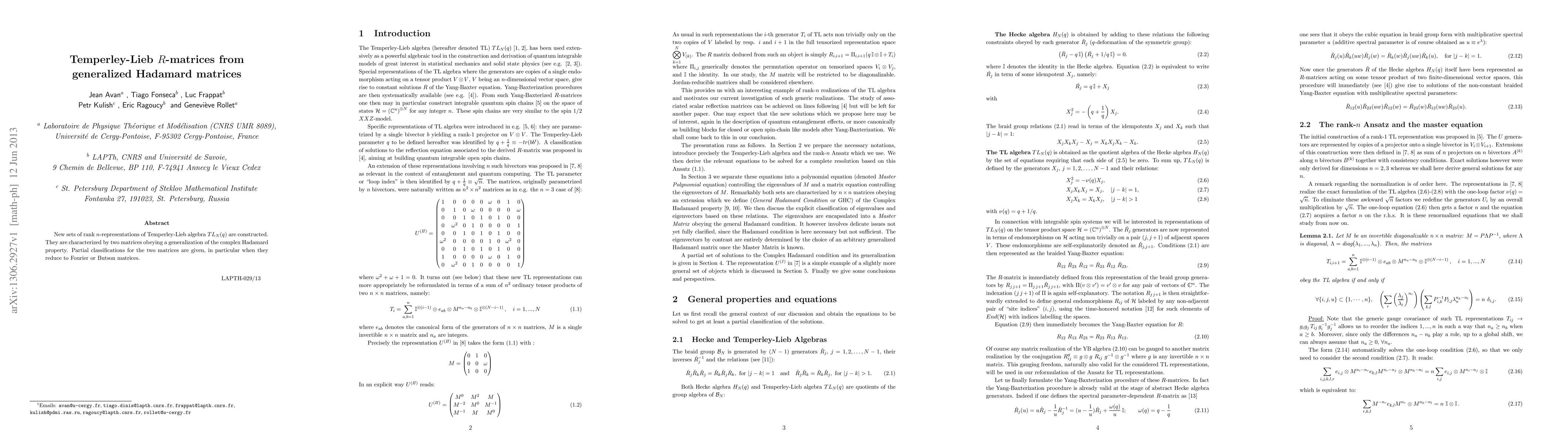 This paper constructs new rank n-representations of the Temperley-Lieb algebra TL_N(q) using matrices that generalize the Hadamard property. It also classifies these matrices under specific conditions, such as when they reduce to Fourier or Butson matrices.