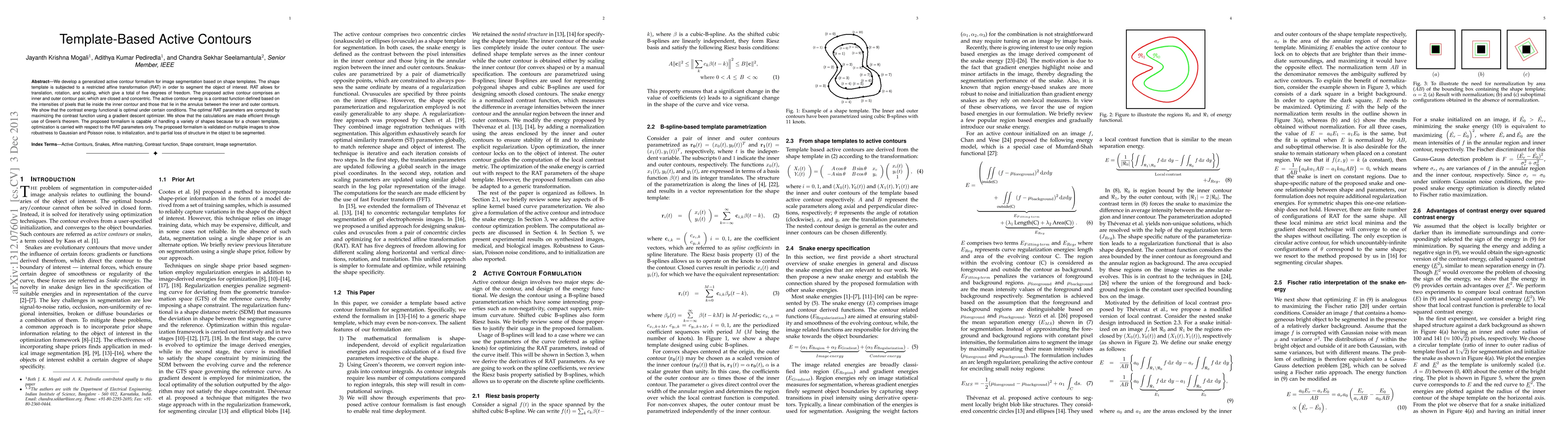 We develop a generalized active contour formalism for image segmentation based on shape templates. The shape template is subjected to a restricted affine transformation (RAT) in order to segment the object of interest. RAT allows for translation, rotation, and scaling, which give a total of five degrees of freedom. The proposed active contour comprises an inner and outer contour pair, which are closed and concentric. The active contour energy is a contrast function defined based on the intensities of pixels that lie inside the inner contour and those that lie in the annulus between the inner and outer contours. We show that the contrast energy functional is optimal under certain conditions. The optimal RAT parameters are computed by maximizing the contrast function using a gradient descent optimizer. We show that the calculations are made efficient through use of Green's theorem. The proposed formalism is capable of handling a variety of shapes because for a chosen template, optimization is carried with respect to the RAT parameters only. The proposed formalism is validated on multiple images to show robustness to Gaussian and Poisson noise, to initialization, and to partial loss of structure in the object to be segmented.