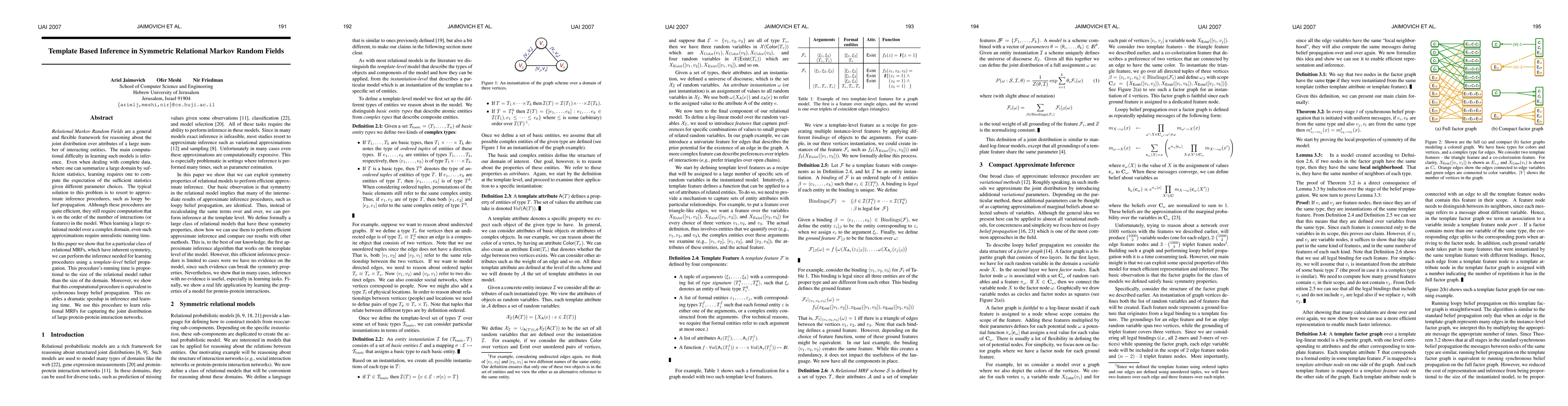 This paper proposes a template-based inference method for symmetric Relational Markov Random Fields (RMRFs) that significantly reduces computational complexity from domain size to model size. This approach enables faster learning and inference, demonstrated through its application to large protein-protein interaction networks.