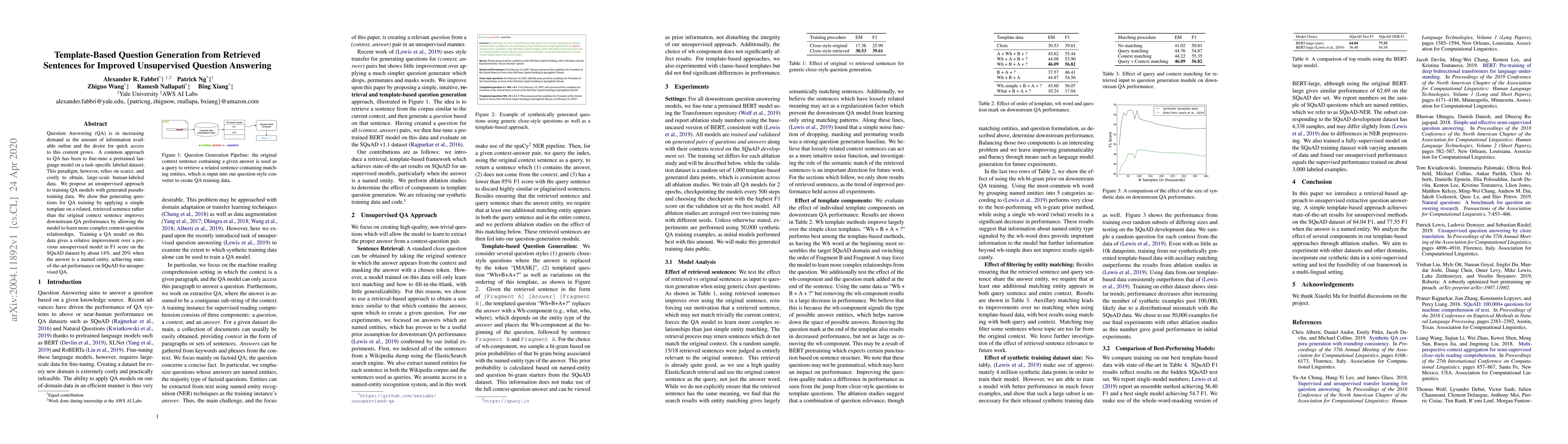 This paper proposes an unsupervised method for training question answering (QA) models using template-based question generation from retrieved sentences, achieving a 14% relative improvement in F1 score on the SQuAD dataset compared to previous unsupervised models, especially a 20% boost when the answer is a named entity.