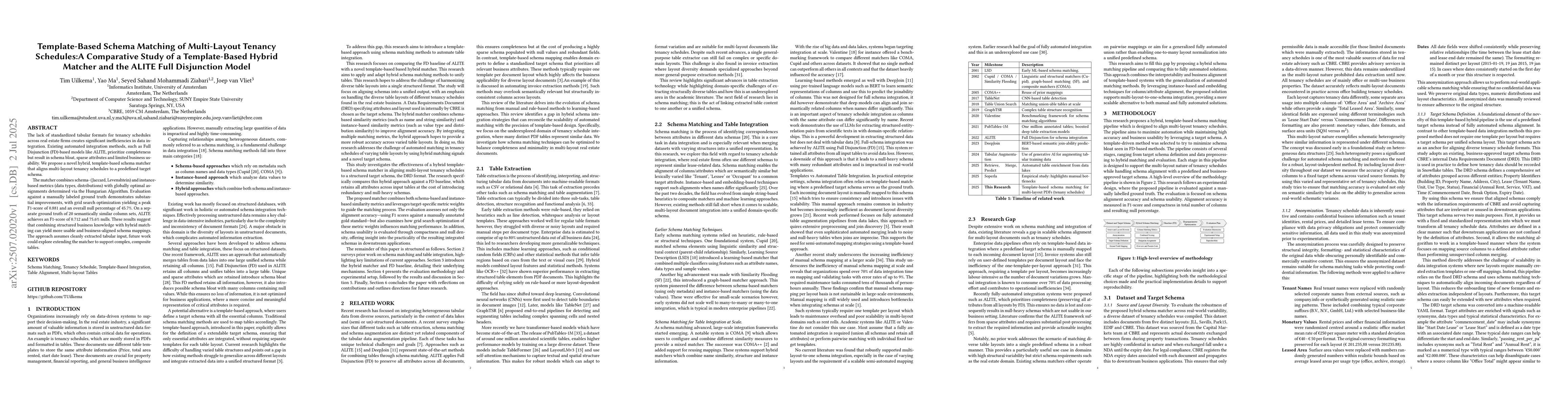 The lack of standardized tabular formats for tenancy schedules across real estate firms creates significant inefficiencies in data integration. Existing automated integration methods, such as Full Disjunction (FD)-based models like ALITE, prioritize completeness but result in schema bloat, sparse attributes and limited business usability. We propose a novel hybrid, template-based schema matcher that aligns multi-layout tenancy schedules to a predefined target schema. The matcher combines schema (Jaccard, Levenshtein) and instance-based metrics (data types, distributions) with globally optimal assignments determined via the Hungarian Algorithm. Evaluation against a manually labeled ground truth demonstrates substantial improvements, with grid search optimization yielding a peak F1-score of 0.881 and an overall null percentage of 45.7%. On a separate ground truth of 20 semantically similar column sets, ALITE achieves an F1-score of 0.712 and 75.6% nulls. These results suggest that combining structured business knowledge with hybrid matching can yield more usable and business-aligned schema mappings. The approach assumes cleanly extracted tabular input, future work could explore extending the matcher to support complex, composite tables.