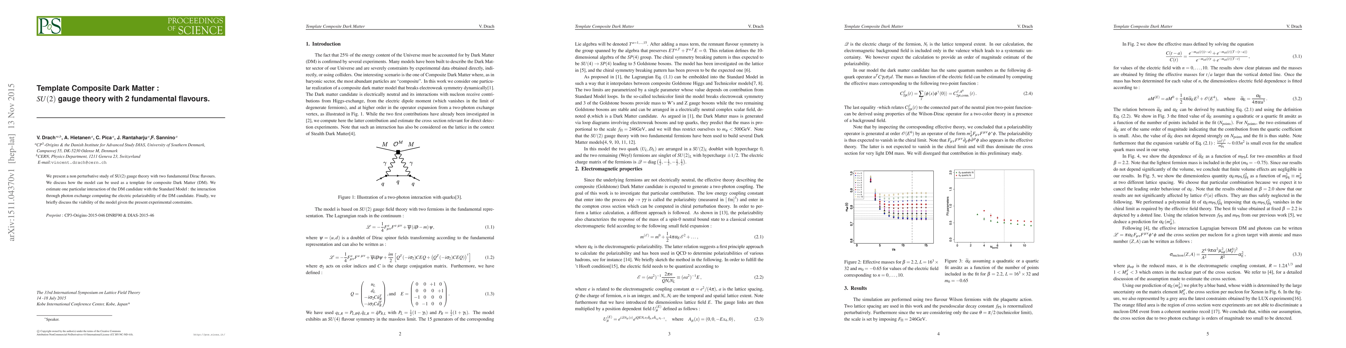 We present a non perturbative study of SU(2) gauge theory with two fundamental Dirac flavours. We discuss how the model can be used as a template for composite Dark Matter (DM). We estimate one particular interaction of the DM candidate with the Standard Model : the interaction through photon exchange computing the electric polarizability of the DM candidate. Finally, we briefly discuss the viability of the model given the present experimental constraints.
