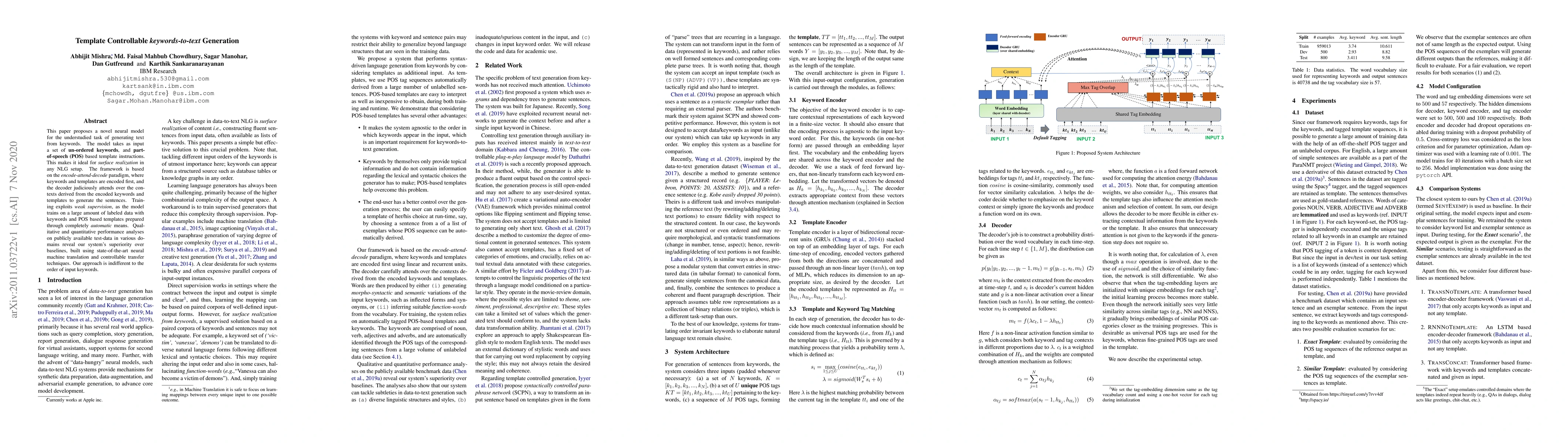 The paper introduces a new neural model with an attention mechanism that effectively translates keywords into diverse structured and styled sentences, while being insensitive to keyword order changes.