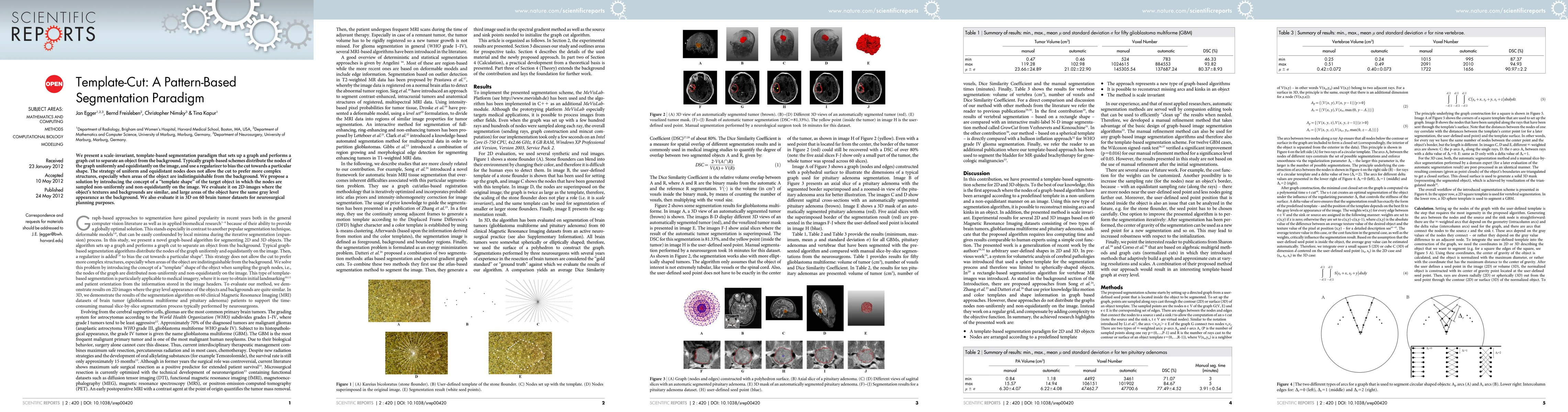 We present a scale-invariant, template-based segmentation paradigm that sets up a graph and performs a graph cut to separate an object from the background. Typically graph-based schemes distribute the nodes of the graph uniformly and equidistantly on the image, and use a regularizer to bias the cut towards a particular shape. The strategy of uniform and equidistant nodes does not allow the cut to prefer more complex structures, especially when areas of the object are indistinguishable from the background. We propose a solution by introducing the concept of a "template shape" of the target object in which the nodes are sampled non-uniformly and non-equidistantly on the image. We evaluate it on 2D-images where the object's textures and backgrounds are similar, and large areas of the object have the same gray level appearance as the background. We also evaluate it in 3D on 60 brain tumor datasets for neurosurgical planning purposes.