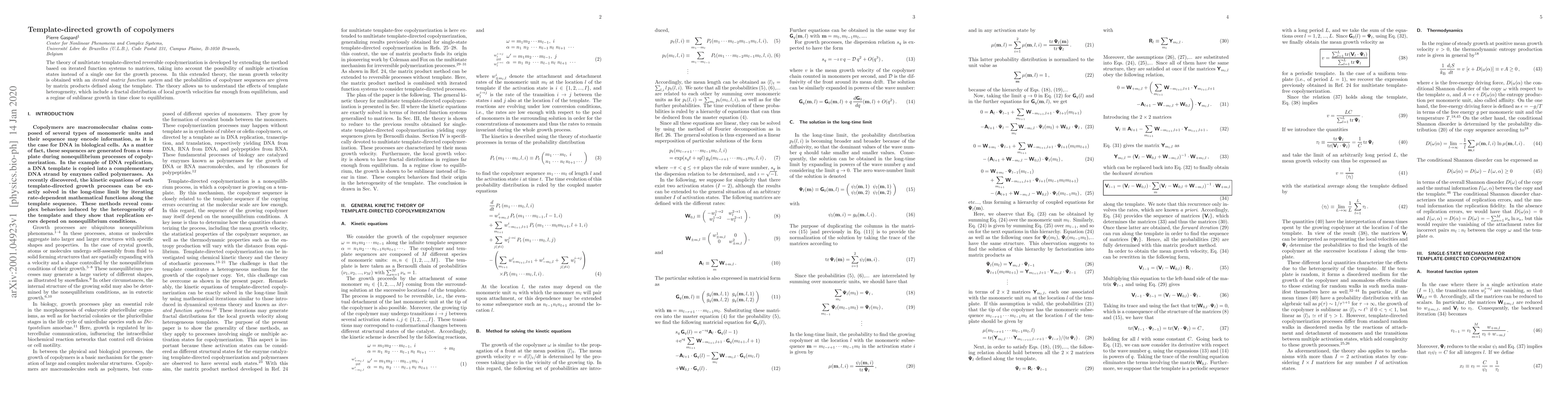 The theory of multistate template-directed reversible copolymerization is developed by extending the method based on iterated function systems to matrices, taking into account the possibility of multiple activation states instead of a single one for the growth process. In this extended theory, the mean growth velocity is obtained with an iterated matrix function system and the probabilities of copolymer sequences are given by matrix products defined along the template. The theory allows us to understand the effects of template heterogeneity, which include a fractal distribution of local growth velocities far enough from equilibrium, and a regime of sublinear growth in time close to equilibrium.