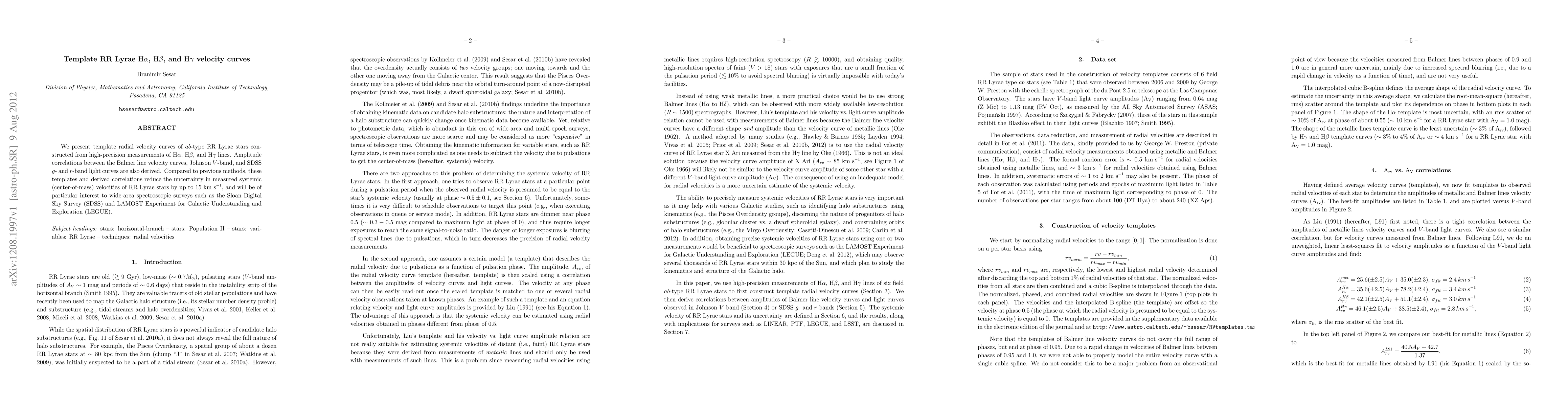 The paper presents high-precision radial velocity templates for Hα, Hβ, and Hγ lines of ab-type RR Lyrae stars, along with correlations between Balmer lines velocity curve amplitudes and V-band light curve amplitudes.