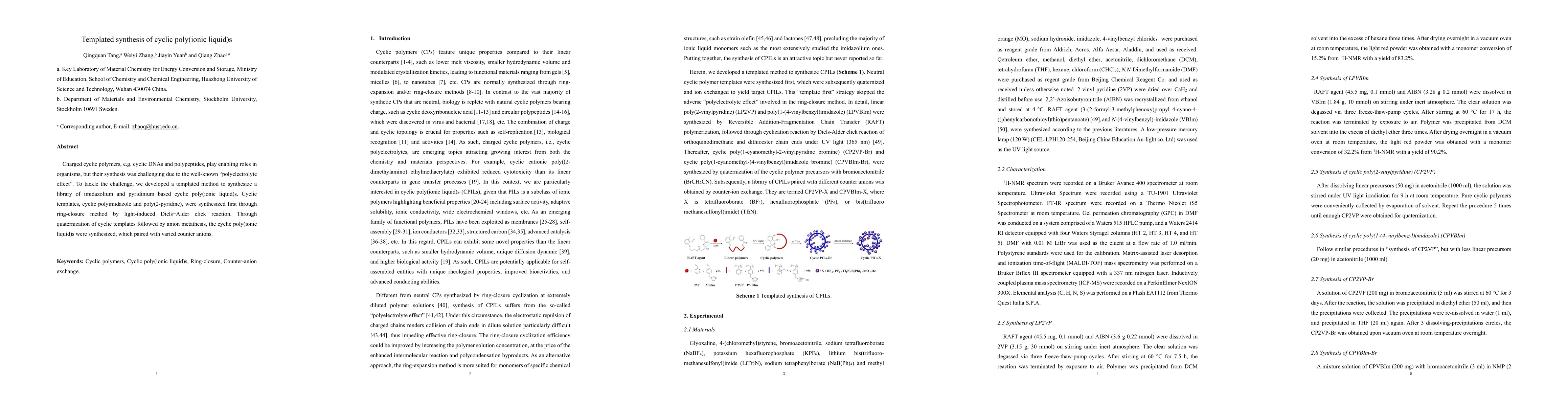 This paper presents a templated method for synthesizing cyclic poly(ionic liquid)s using imidazolium and pyridinium bases, overcoming the polyelectrolyte effect. The process involves creating cyclic templates via a light-induced Diels-Alder reaction, followed by quaternization and anion metathesis to obtain the desired cyclic poly(ionic liquid)s with different counter anions.