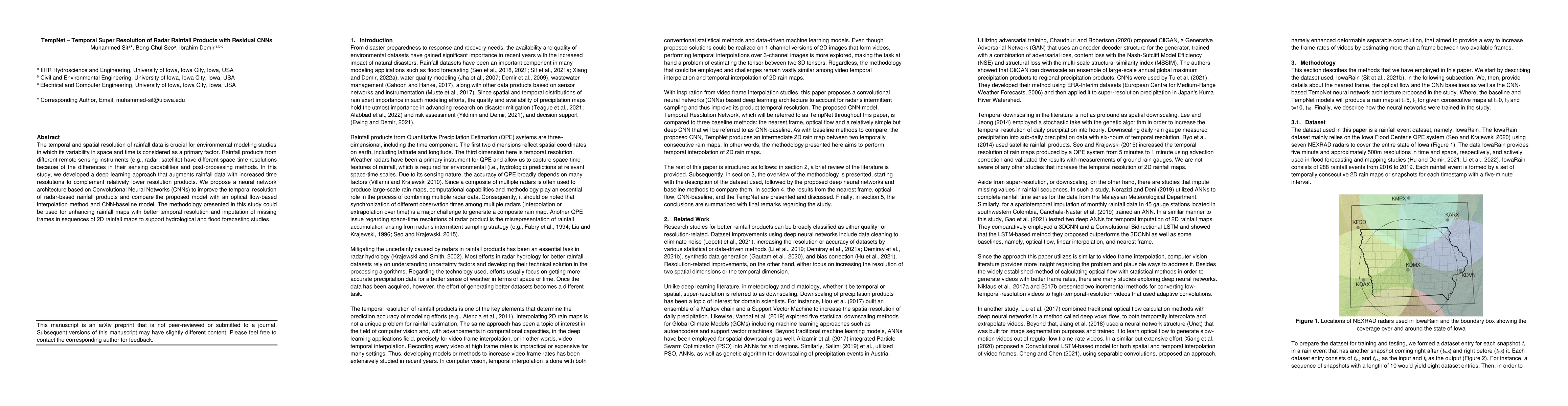 This paper introduces TempNet, a deep learning approach using residual CNNs to enhance the temporal resolution of radar-based rainfall products. The proposed model improves upon optical flow-based methods and a CNN baseline, aiming to support hydrological and flood forecasting studies with better temporal resolution rainfall data.