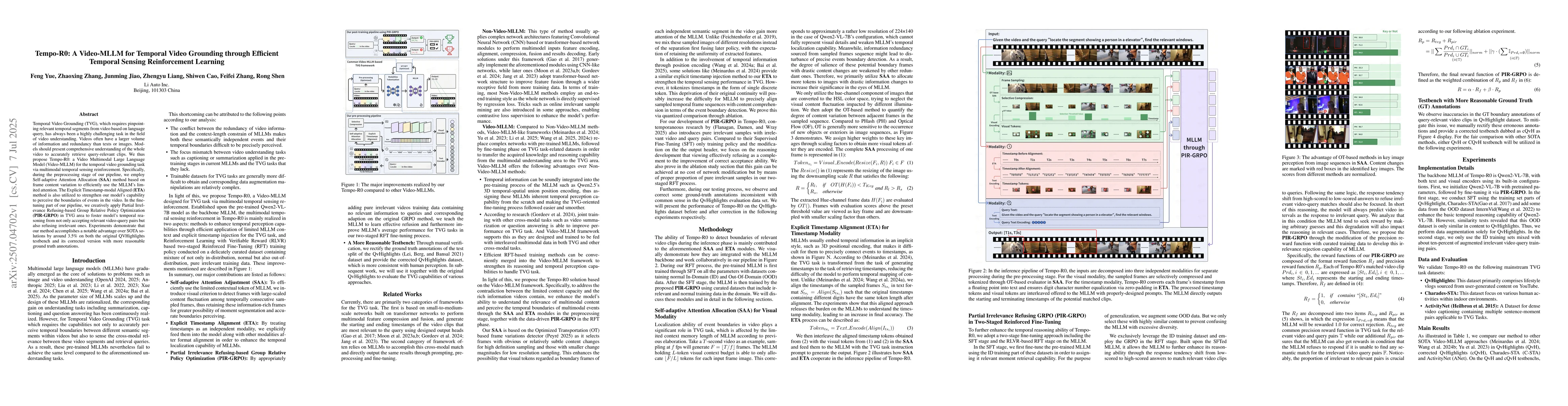 Temporal Video Grounding (TVG), which requires pinpointing relevant temporal segments from video based on language query, has always been a highly challenging task in the field of video understanding. Videos often have a larger volume of information and redundancy than texts or images. Models should present comprehensive understanding of the whole video to accurately retrieve query-relevant clips. We thus propose Tempo-R0: a Video Multimodal Large Language Model (Video-MLLM) for the temporal video grounding task via multimodal temporal sensing reinforcement. Specifically, during the preprocessing stage of our pipeline, we employ Self-adaptive Attention Allocation (SAA) method based on frame content variation to efficiently use the MLLM's limited attention. The Explicit Timestamp-modal Aligned (ETA) method is also utilized to strengthen our model's capability to perceive the boundaries of events in the video. In the fine-tuning part of our pipeline, we creatively apply Partial Irrelevance Refusing-based Group Relative Policy Optimization (PIR-GRPO) in TVG area to foster model's temporal reasoning from not only accepting relevant video-query pairs but also refusing irrelevant ones. Experiments demonstrate that our method accomplishes a notable advantage over SOTA solutions by around 3.5% on both the original QVHighlights testbench and its corrected version with more reasonable ground truth annotations.