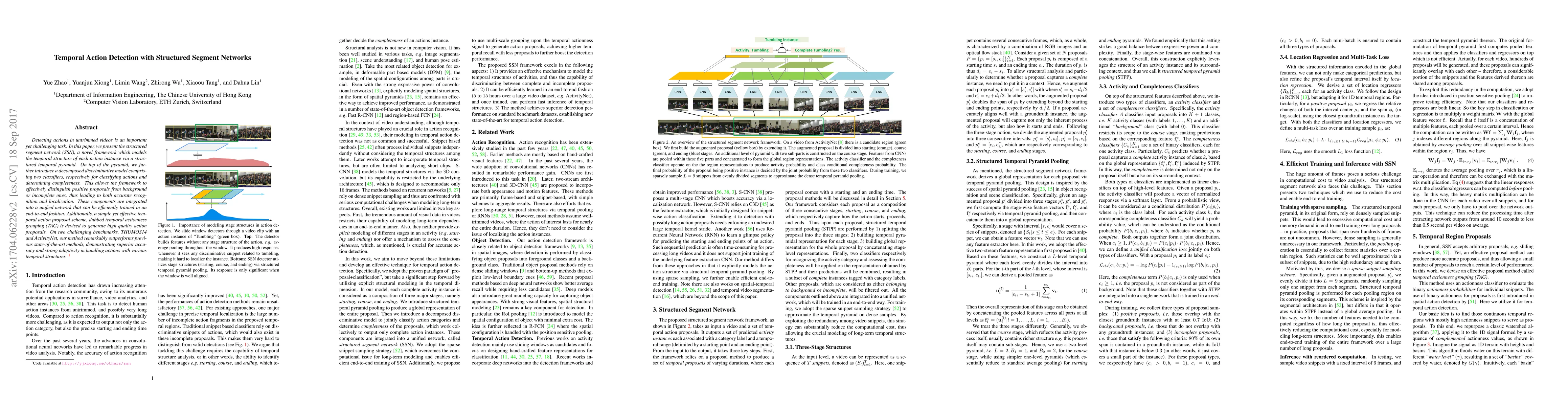 This paper introduces the Structured Segment Network (SSN) for temporal action detection in untrimmed videos, utilizing a temporal pyramid and two classifiers for action classification and completeness determination. The proposed method, combined with a temporal actionness grouping (TAG) scheme, outperforms previous methods on THUMOS14 and ActivityNet benchmarks.